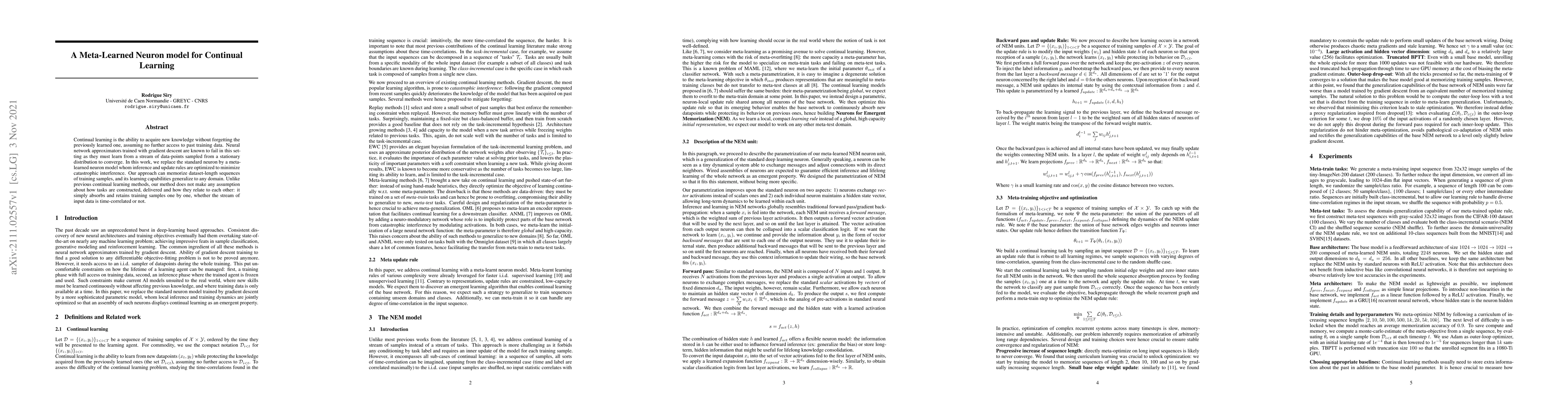 Continual learning is the ability to acquire new knowledge without forgetting the previously learned one, assuming no further access to past training data. Neural network approximators trained with gradient descent are known to fail in this setting as they must learn from a stream of data-points sampled from a stationary distribution to converge. In this work, we replace the standard neuron by a meta-learned neuron model whom inference and update rules are optimized to minimize catastrophic interference. Our approach can memorize dataset-length sequences of training samples, and its learning capabilities generalize to any domain. Unlike previous continual learning methods, our method does not make any assumption about how tasks are constructed, delivered and how they relate to each other: it simply absorbs and retains training samples one by one, whether the stream of input data is time-correlated or not.
