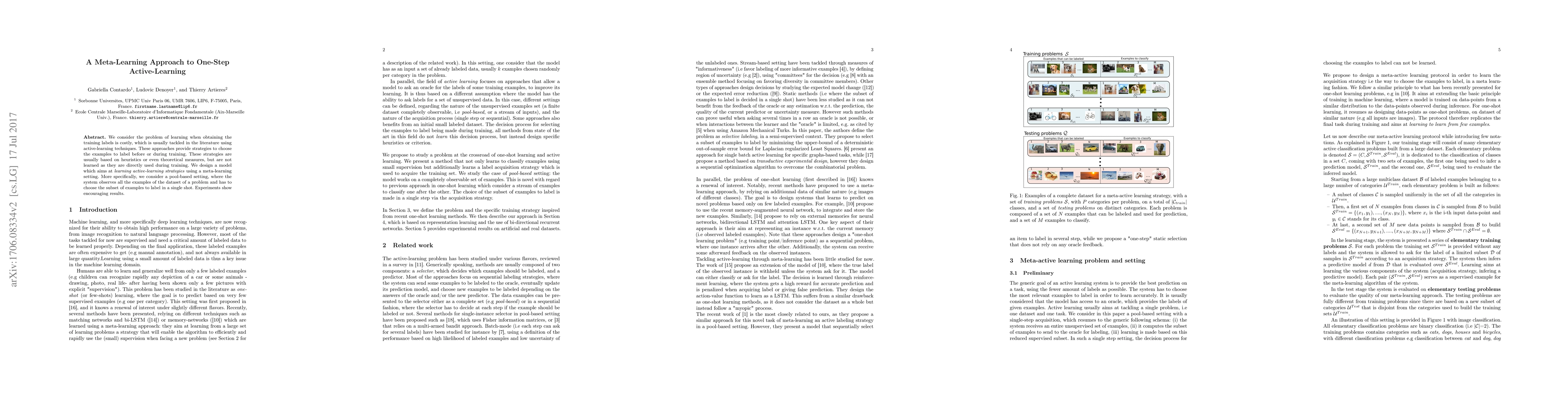 We consider the problem of learning when obtaining the training labels is costly, which is usually tackled in the literature using active-learning techniques. These approaches provide strategies to choose the examples to label before or during training. These strategies are usually based on heuristics or even theoretical measures, but are not learned as they are directly used during training. We design a model which aims at \textit{learning active-learning strategies} using a meta-learning setting. More specifically, we consider a pool-based setting, where the system observes all the examples of the dataset of a problem and has to choose the subset of examples to label in a single shot. Experiments show encouraging results.