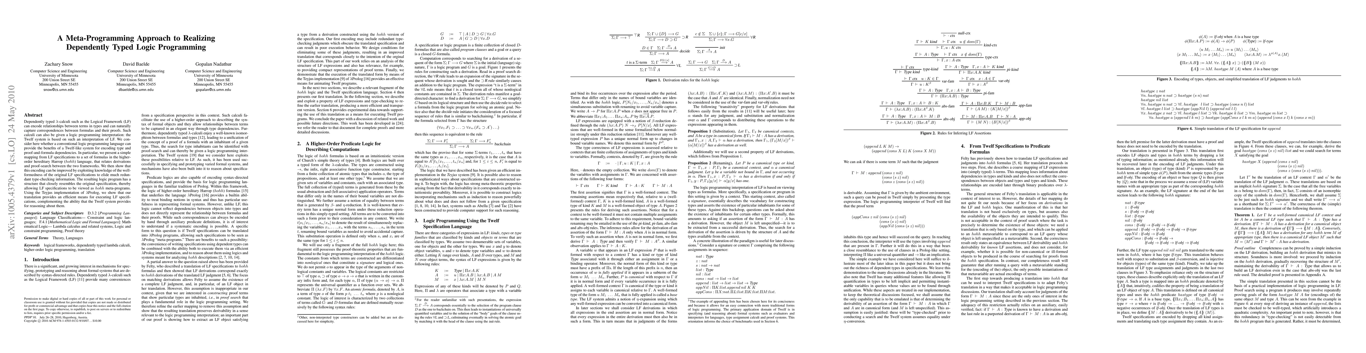 This paper explores a meta-programming approach to dependently typed logic programming, translating Logical Framework specifications into higher-order hereditary Harrop language formulas for efficient execution.