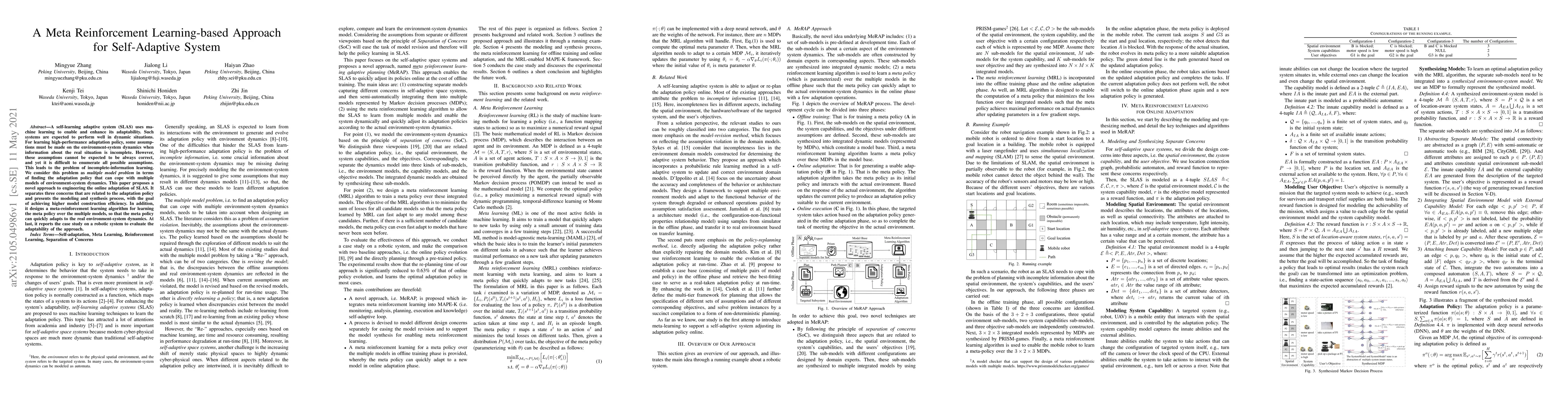 A self-learning adaptive system (SLAS) uses machine learning to enable and enhance its adaptability. Such systems are expected to perform well in dynamic situations. For learning high-performance adaptation policy, some assumptions must be made on the environment-system dynamics when information about the real situation is incomplete. However, these assumptions cannot be expected to be always correct, and yet it is difficult to enumerate all possible assumptions. This leads to the problem of incomplete-information learning. We consider this problem as multiple model problem in terms of finding the adaptation policy that can cope with multiple models of environment-system dynamics. This paper proposes a novel approach to engineering the online adaptation of SLAS. It separates three concerns that are related to the adaptation policy and presents the modeling and synthesis process, with the goal of achieving higher model construction efficiency. In addition, it designs a meta-reinforcement learning algorithm for learning the meta policy over the multiple models, so that the meta policy can quickly adapt to the real environment-system dynamics. At last, it reports the case study on a robotic system to evaluate the adaptability of the approach.