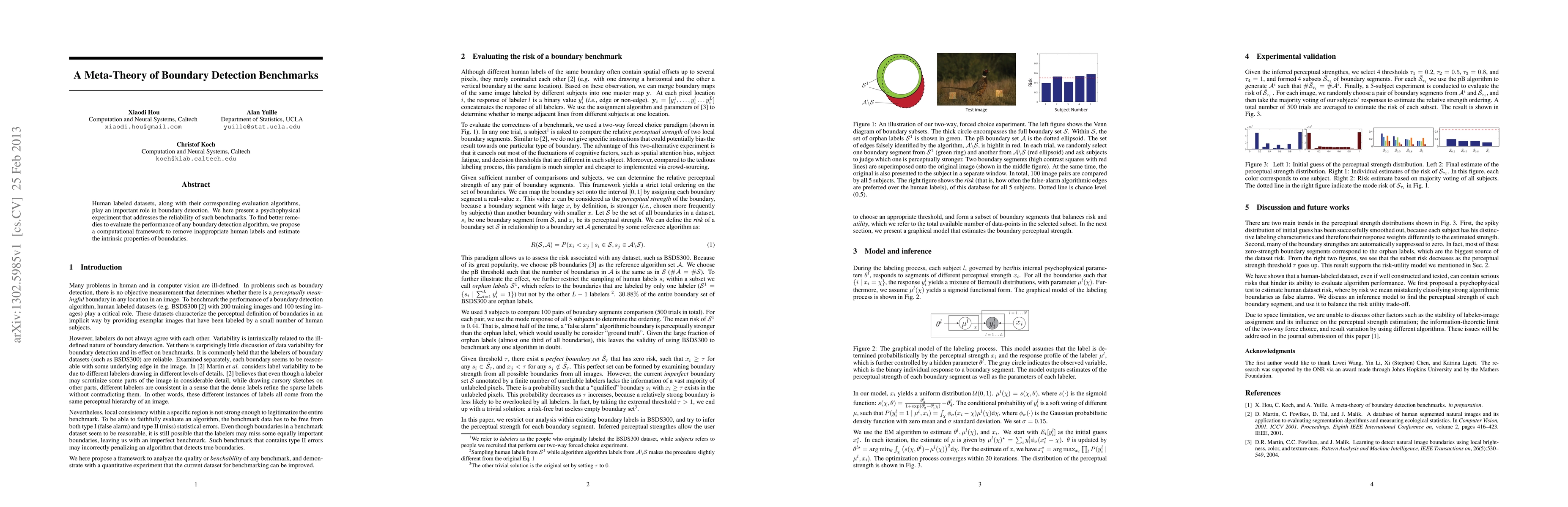 The paper presents a psychophysical experiment to assess the reliability of human-labeled datasets used for boundary detection benchmarks. A computational framework is proposed to remove inappropriate human labels and estimate the intrinsic properties of boundaries.
