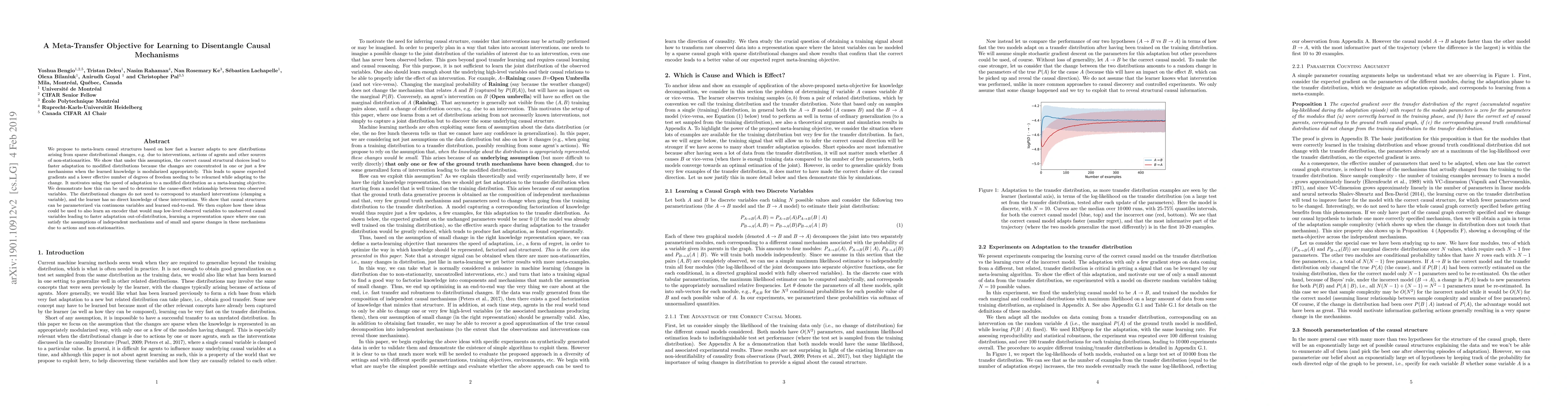 We propose to meta-learn causal structures based on how fast a learner adapts to new distributions arising from sparse distributional changes, e.g. due to interventions, actions of agents and other sources of non-stationarities. We show that under this assumption, the correct causal structural choices lead to faster adaptation to modified distributions because the changes are concentrated in one or just a few mechanisms when the learned knowledge is modularized appropriately. This leads to sparse expected gradients and a lower effective number of degrees of freedom needing to be relearned while adapting to the change. It motivates using the speed of adaptation to a modified distribution as a meta-learning objective. We demonstrate how this can be used to determine the cause-effect relationship between two observed variables. The distributional changes do not need to correspond to standard interventions (clamping a variable), and the learner has no direct knowledge of these interventions. We show that causal structures can be parameterized via continuous variables and learned end-to-end. We then explore how these ideas could be used to also learn an encoder that would map low-level observed variables to unobserved causal variables leading to faster adaptation out-of-distribution, learning a representation space where one can satisfy the assumptions of independent mechanisms and of small and sparse changes in these mechanisms due to actions and non-stationarities.