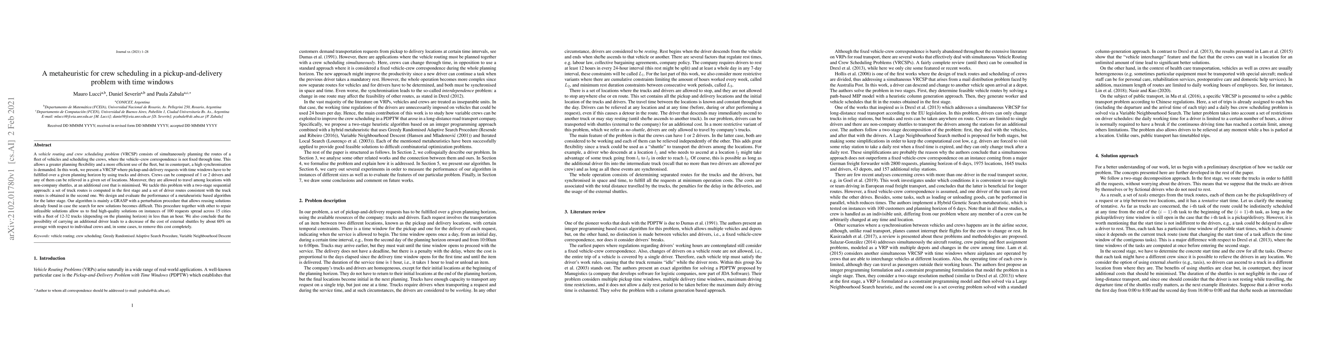 A vehicle routing and crew scheduling problem (VRCSP) consists of simultaneously planning the routes of a fleet of vehicles and scheduling the crews, where the vehicle-crew correspondence is not fixed through time. This allows a greater planning flexibility and a more efficient use of the fleet, but in counterpart, a high synchronisation is demanded. In this work, we present a VRCSP where pickup-and-delivery requests with time windows have to be fulfilled over a given planning horizon by using trucks and drivers. Crews can be composed of 1 or 2 drivers and any of them can be relieved in a given set of locations. Moreover, they are allowed to travel among locations with non-company shuttles, at an additional cost that is minimised. As our problem considers distinct routes for trucks and drivers, we have an additional flexibility not contemplated in other previous VRCSP given in the literature where a crew is handled as an indivisible unit. We tackle this problem with a two-stage sequential approach: a set of truck routes is computed in the first stage and a set of driver routes consistent with the truck routes is obtained in the second one. We design and evaluate the performance of a metaheuristic based algorithm for the latter stage. Our algorithm is mainly a GRASP with a perturbation procedure that allows reusing solutions already found in case the search for new solutions becomes difficult. This procedure together with other to repair infeasible solutions allow us to find high-quality solutions on instances of 100 requests spread across 15 cities with a fleet of 12-32 trucks (depending on the planning horizon) in less than an hour. We also conclude that the possibility of carrying an additional driver leads to a decrease of the cost of external shuttles by about 60% on average with respect to individual crews and, in some cases, to remove this cost completely.
