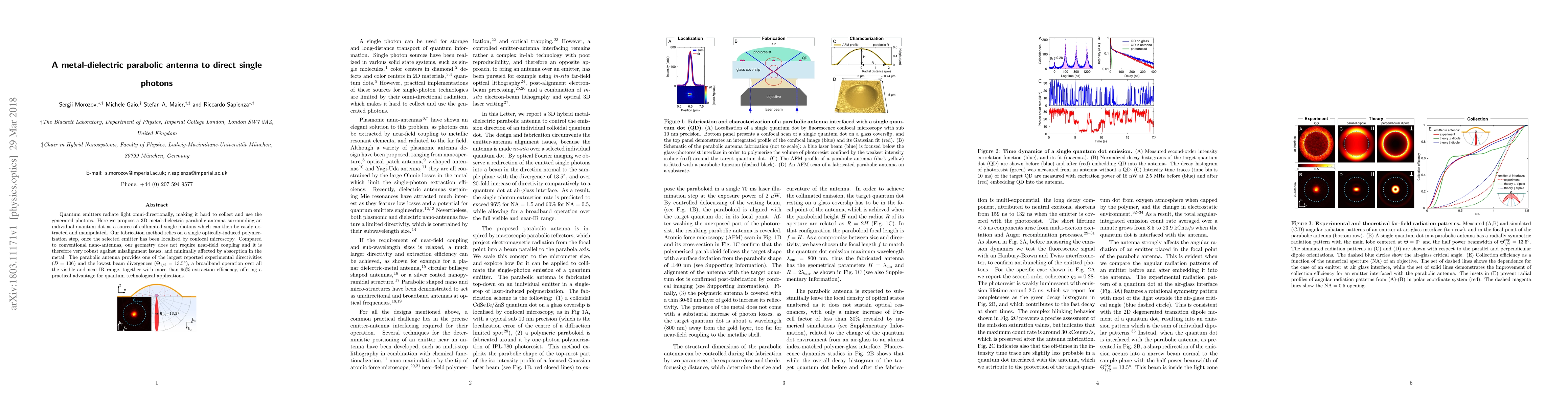 This paper proposes a 3D metal-dielectric parabolic antenna to direct single photons from quantum dots, achieving high directivity and extraction efficiency without near-field coupling. The design offers robust performance and broad operational bandwidth, enhancing practical applications in quantum technology.