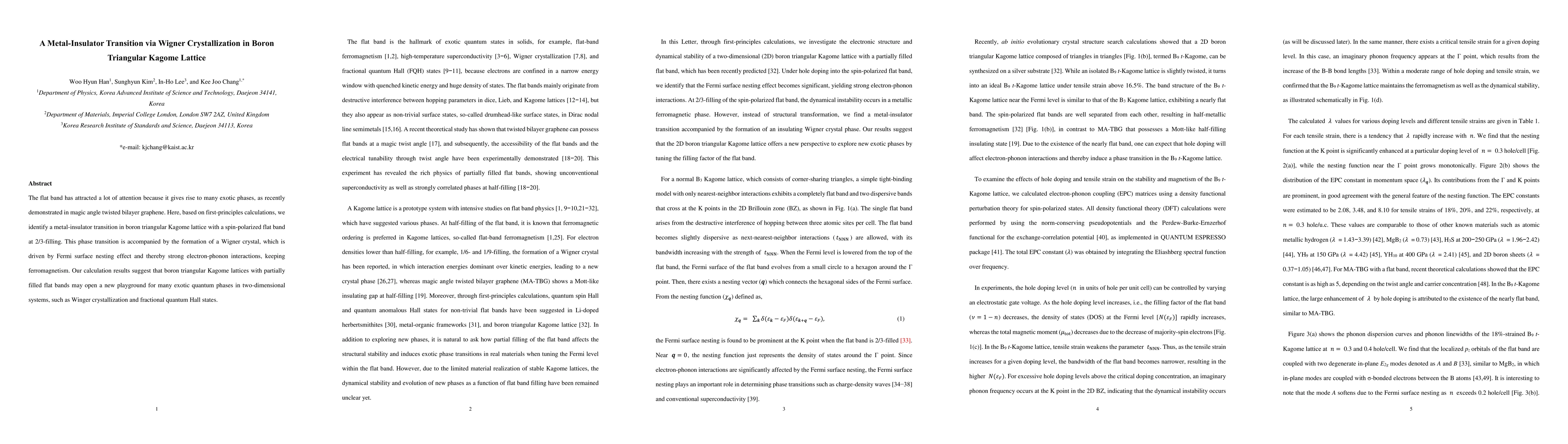 This paper identifies a metal-insulator transition in boron triangular Kagome lattice driven by Wigner crystallization at 2/3-filling, facilitated by strong electron-phonon interactions and Fermi surface nesting. The study suggests potential for exotic quantum phases in two-dimensional systems.