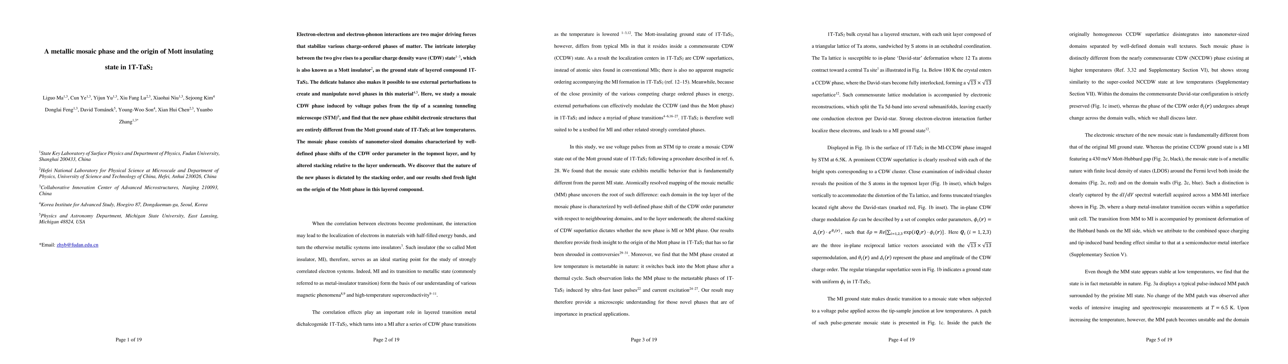 This paper explores the metallic mosaic phase induced in 1T-TaS2 by voltage pulses from an STM tip, revealing a new charge density wave state distinct from the Mott insulating ground state. The mosaic phase features nanometer-sized domains with altered stacking order, providing insights into the origin of the Mott insulating state in the material.