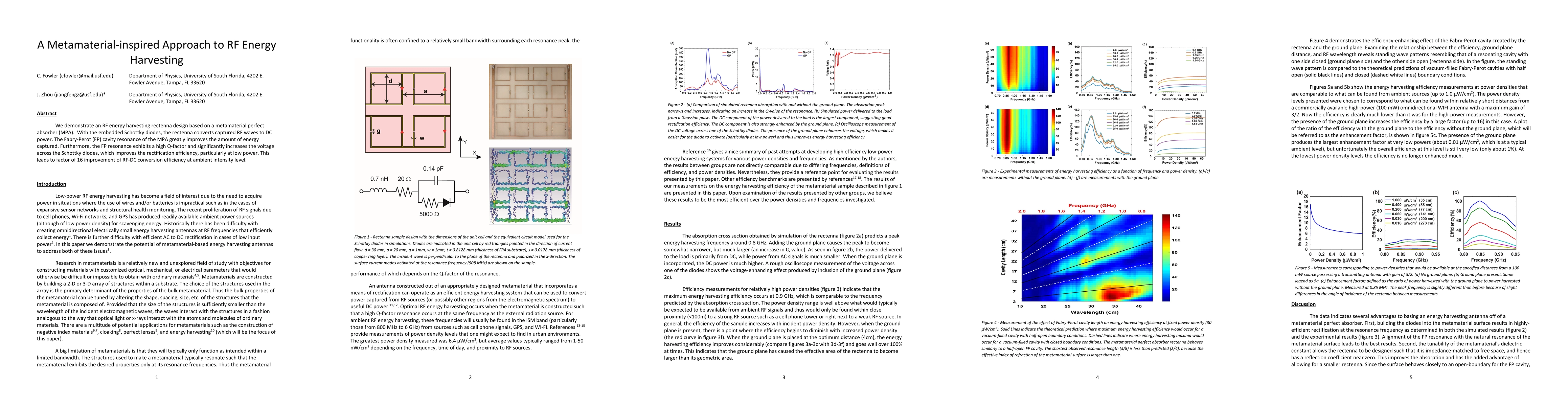 This paper presents a metamaterial-inspired RF energy harvesting rectenna utilizing a metamaterial perfect absorber with embedded Schottky diodes to convert RF waves to DC power. The design leverages Fabry-Perot cavity resonance to enhance energy capture and rectification efficiency, achieving a 16-fold improvement in conversion efficiency at low power levels.