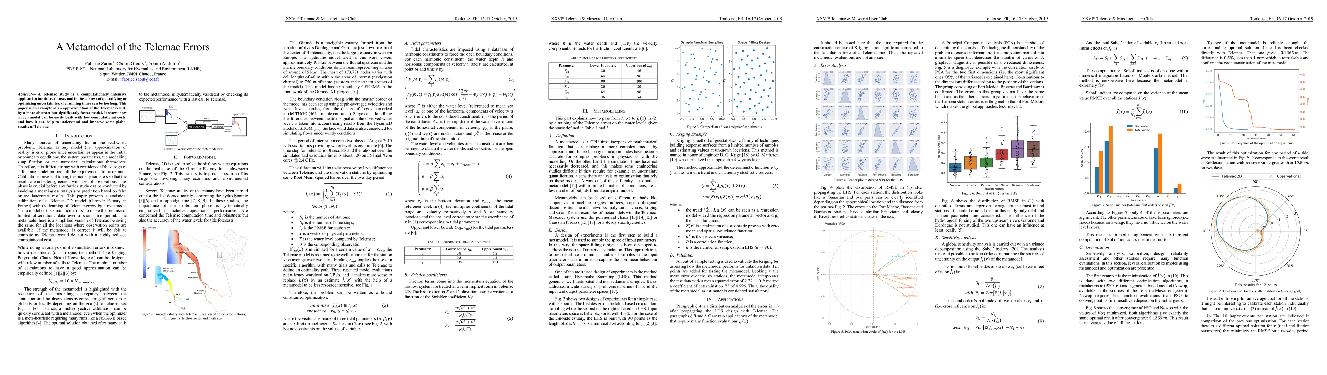 A Telemac study is a computationally intensive application for the real cases and in the context of quantifying or optimizing uncertainties, the running times can be too long. This paper is an example of an approximation of the Telemac results by a more abstract but significantly faster model. It shows how a metamodel can be easily built with low computational costs, and how it can help to understand and improve some global results of Telemac. I. INTRODUCTION Many sources of uncertainty lie in the real-world problems. Telemac as any model (i.e. approximation of reality) is error prone since uncertainties appear in the initial or boundary conditions, the system parameters, the modelling simplification or the numerical calculations themselves. Therefore, it is difficult to say with confidence if the design of a Telemac model has met all the requirements to be optimal. Calibration consists of tuning the model parameters so that the results are in better agreement with a set of observations. This phase is crucial before any further study can be conducted by avoiding a meaningless analysis or prediction based on false or too inaccurate results. This paper presents a statistical calibration of a Telemac 2D model (Gironde Estuary in France) with the learning of Telemac errors by a metamodel (i.e. a model of the simulation errors) to make the best use of limited observations data over a short time period. The metamodel here is a simplified version of Telemac behaving the same for all the locations where observation points are available. If the metamodel is correct, it will be able to compute as Telemac would do but with a highly reduced computational cost.