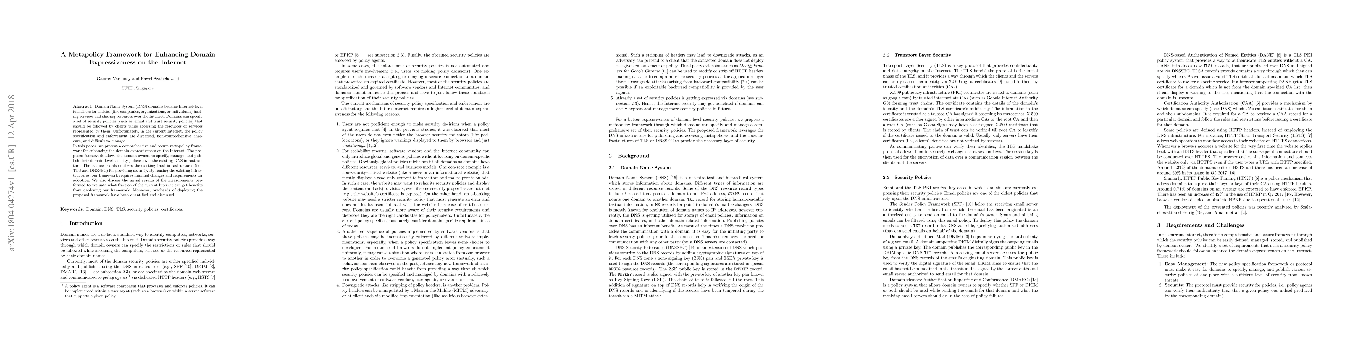 Domain Name System (DNS) domains became Internet-level identifiers for entities (like companies, organizations, or individuals) hosting services and sharing resources over the Internet. Domains can specify a set of security policies (such as, email and trust security policies) that should be followed by clients while accessing the resources or services represented by them. Unfortunately, in the current Internet, the policy specification and enforcement are dispersed, non-comprehensive, insecure, and difficult to manage. In this paper, we present a comprehensive and secure metapolicy framework for enhancing the domain expressiveness on the Internet. The proposed framework allows the domain owners to specify, manage, and publish their domain-level security policies over the existing DNS infrastructure. The framework also utilizes the existing trust infrastructures (i.e., TLS and DNSSEC) for providing security. By reusing the existing infrastructures, our framework requires minimal changes and requirements for adoption. We also discuss the initial results of the measurements performed to evaluate what fraction of the current Internet can get benefits from deploying our framework. Moreover, overheads of deploying the proposed framework have been quantified and discussed.