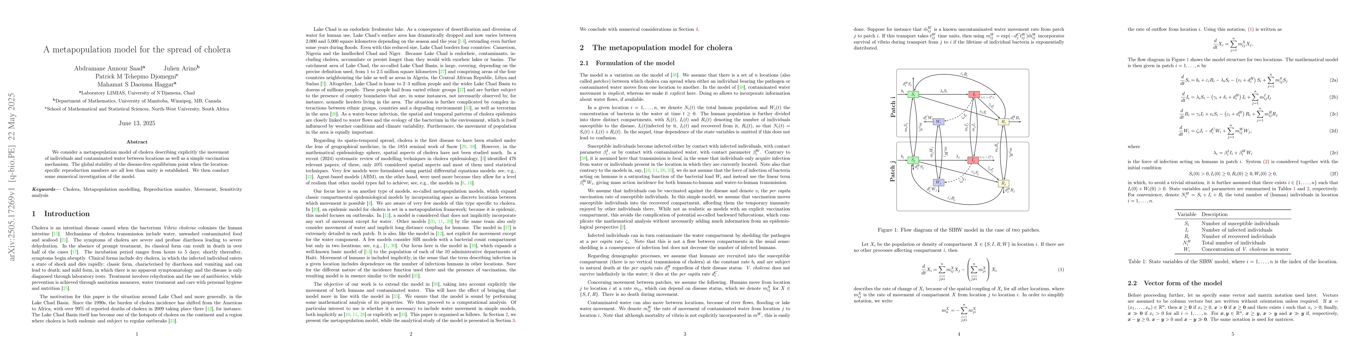 The paper presents a detailed metapopulation model for cholera, analyzing global stability of the disease-free equilibrium point.