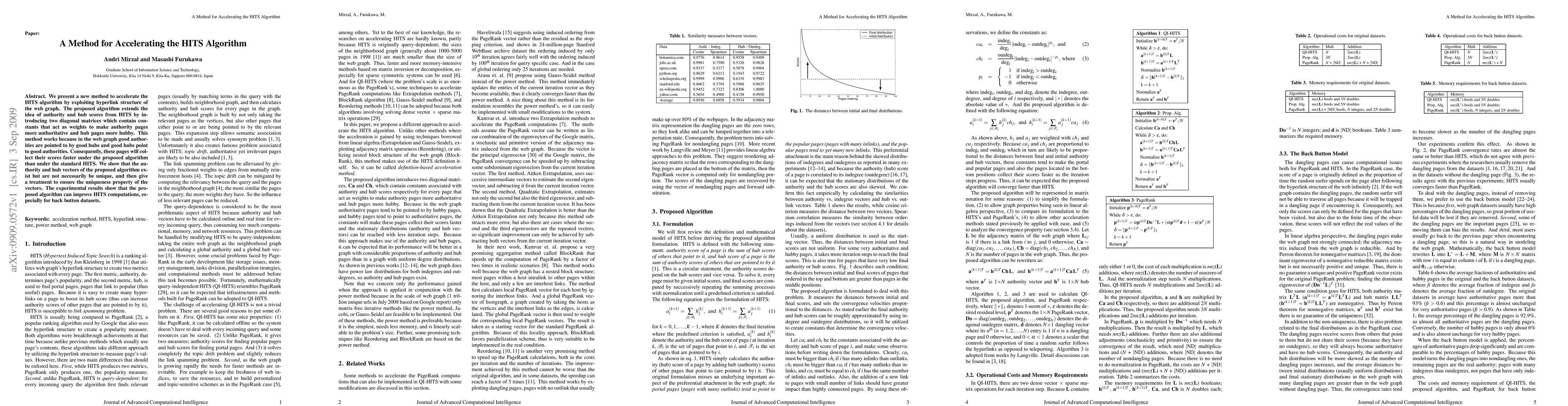 The paper introduces an enhanced HITS (Hyperlink-Induced Topic Search) algorithm that expedites score computation for web pages, leveraging hyperlink structures. It achieves this by incorporating weighted diagonal matrices for authorities and hubs, ensuring faster convergence to scores. The method maintains uniqueness of authority and hub vectors, and experimental results indicate significant improvement, especially for datasets simulating web navigation with back buttons.