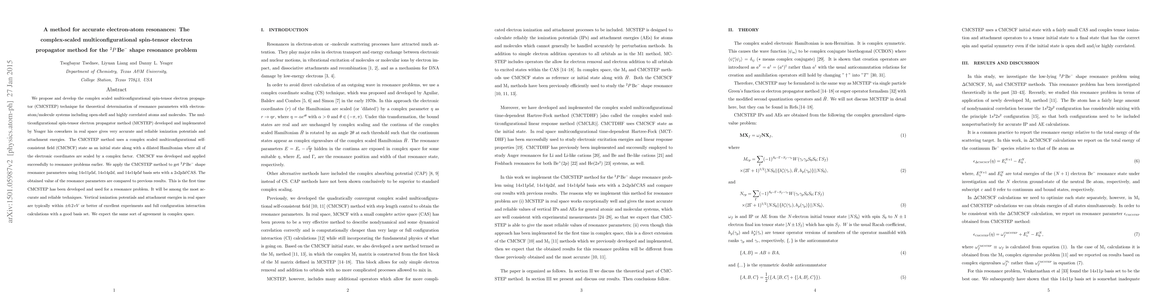 We propose and develop the complex scaled multiconfigurational spin-tensor electron propagator (CMCSTEP) technique for theoretical determination of resonance parameters with electron-atom/molecule systems including open-shell and highly correlated atoms and molecules. The multiconfigurational spin-tensor electron propagator method (MCSTEP) developed and implemented by Yeager his coworkers in real space gives very accurate and reliable ionization potentials and attachment energies. The CMCSTEP method uses a complex scaled multiconfigurational self-consistent field (CMCSCF) state as an initial state along with a dilated Hamiltonian where all of the electronic coordinates are scaled by a complex factor. CMCSCF was developed and applied successfully to resonance problems earlier. We apply the CMCSTEP method to get $^2 P\,\mbox{Be}^{-}$ shape resonance parameters using $14s11p5d$, $14s14p2d$, and $14s14p5d$ basis sets with a $2s2p3d$\,CAS. The obtained value of the resonance parameters are compared to previous results. This is the first time CMCSTEP has been developed and used for a resonance problem. It will be among the most accurate and reliable techniques. Vertical ionization potentials and attachment energies in real space are typically within $\pm 0.2\,eV$ or better of excellent experiments and full configuration interaction calculations with a good basis set. We expect the same sort of agreement in complex space.