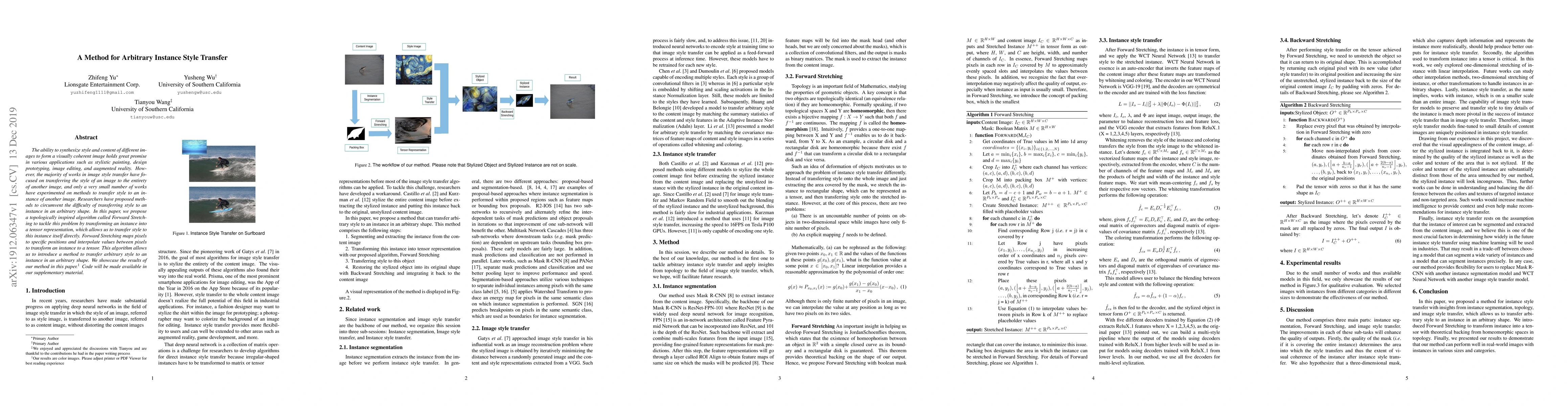 The ability to synthesize style and content of different images to form a visually coherent image holds great promise in various applications such as stylistic painting, design prototyping, image editing, and augmented reality. However, the majority of works in image style transfer have focused on transferring the style of an image to the entirety of another image, and only a very small number of works have experimented on methods to transfer style to an instance of another image. Researchers have proposed methods to circumvent the difficulty of transferring style to an instance in an arbitrary shape. In this paper, we propose a topologically inspired algorithm called Forward Stretching to tackle this problem by transforming an instance into a tensor representation, which allows us to transfer style to this instance itself directly. Forward Stretching maps pixels to specific positions and interpolate values between pixels to transform an instance to a tensor. This algorithm allows us to introduce a method to transfer arbitrary style to an instance in an arbitrary shape. We showcase the results of our method in this paper.