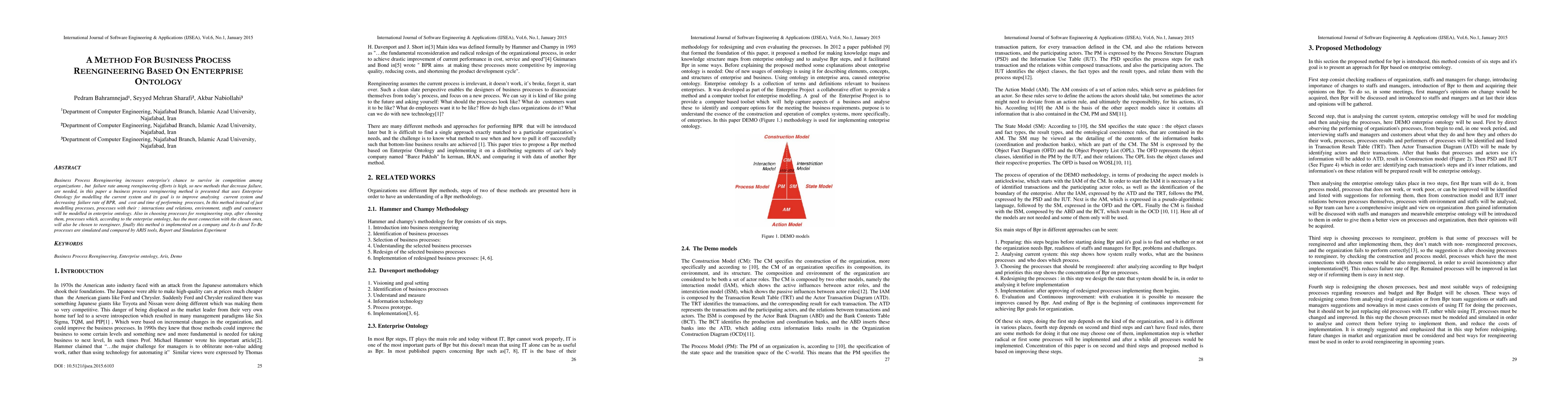 This paper proposes a new method for Business Process Reengineering (BPR) that utilizes Enterprise Ontology to model the current system comprehensively, including interactions, relations, and stakeholders. The method aims to reduce BPR failure rates, costs, and time by selecting interconnected processes for reengineering, and it was tested on a company using ARIS tools.