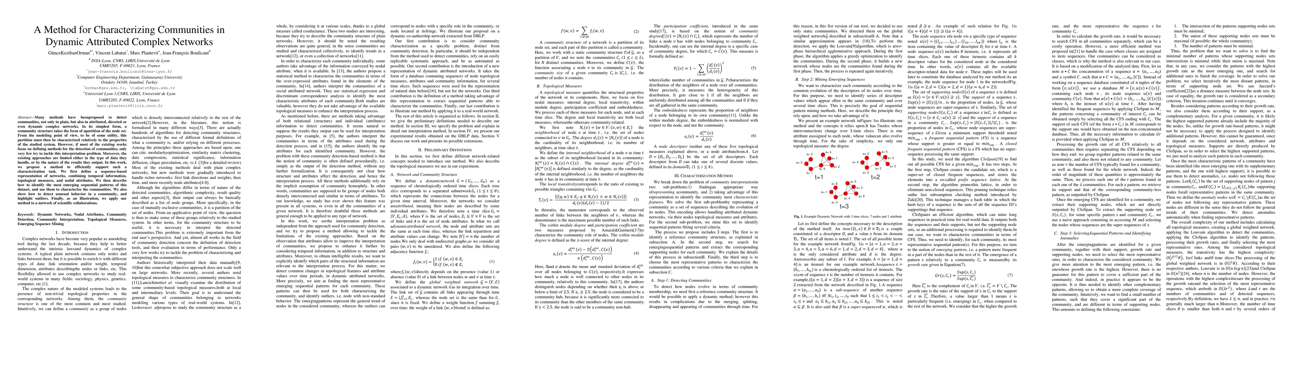 This paper proposes a method for characterizing communities in dynamic attributed networks by defining a sequence-based representation that integrates temporal, topological, and nodal attribute data. The method identifies emerging sequential patterns to characterize communities and detect unusual behaviors, demonstrated through an application to a scientific collaboration network.