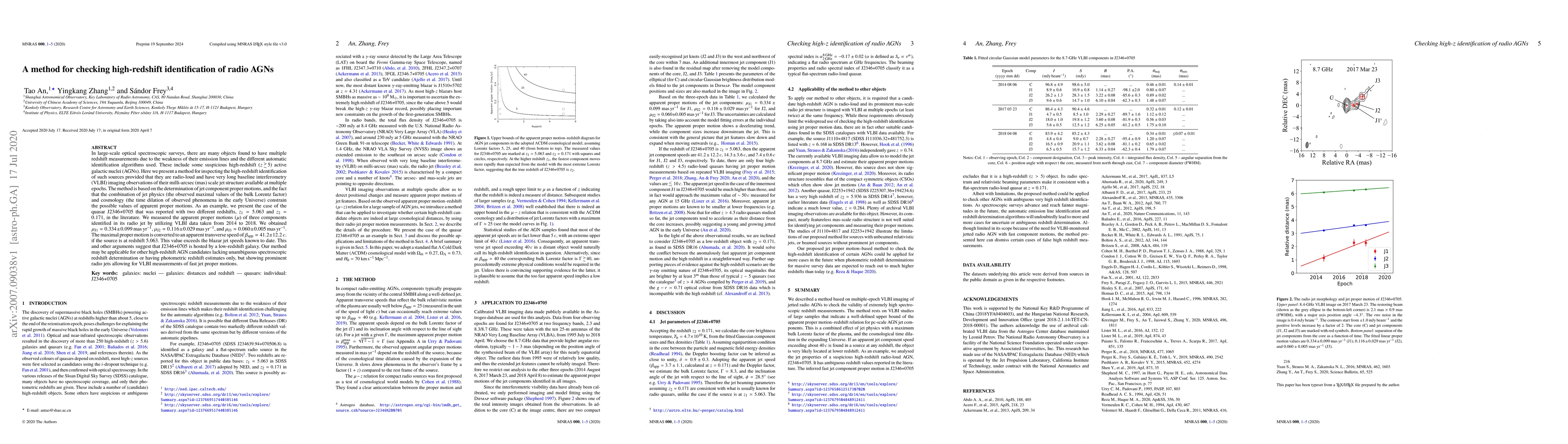 In large-scale optical spectroscopic surveys, there are many objects found to have multiple redshift measurements due to the weakness of their emission lines and the different automatic identification algorithms used. These include some suspicious high-redshift (z >= 5) active galactic nuclei (AGNs). Here we present a method for inspecting the high-redshift identification of such sources provided that they are radio-loud and have very long baseline interferometry (VLBI) imaging observations of their milli-arcsec (mas) scale jet structure available at multiple epochs. The method is based on the determination of jet component proper motions, and the fact that the combination of jet physics (the observed maximal values of the bulk Lorentz factor) and cosmology (the time dilation of observed phenomena in the early Universe) constrain the possible values of apparent proper motions. As an example, we present the case of the quasar J2346+0705 that was reported with two different redshifts, $z_{1} = 5.063$ and $z_{2} = 0.171$, in the literature. We measured the apparent proper motions ($\mu$) of three components identified in its radio jet by utilizing VLBI data taken from 2014 to 2018. We obtained $\mu_{J1} = 0.334 \pm 0.099$ mas yr$^{-1}$, $\mu_{J2} = 0.116 \pm 0.029$ mas yr$^{-1}$, and $\mu_{J3} = 0.060 \pm 0.005$ mas yr$^{-1}$. The maximal proper motion is converted to an apparent transverse speed of $\beta_{\rm app} = 41.2\pm12.2\,c$. if the source is at redshift 5.063. This value exceeds the blazar jet speeds known to date. This and other arguments suggest that J2346+0705 is hosted by a low-redshift galaxy. Our method may be applicable for other high-redshift AGN candidates lacking unambiguous spectroscopic redshift determination or having photometric redshift estimates only, but showing prominent radio jets allowing for VLBI measurements of fast jet proper motions.