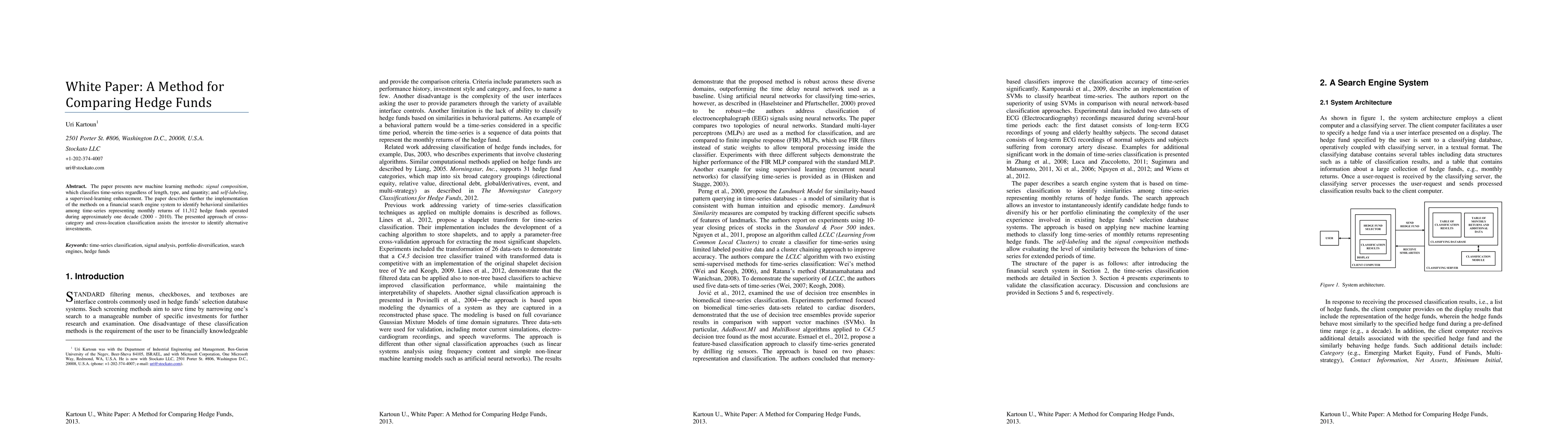 The paper presents new machine learning methods: signal composition, which classifies time-series regardless of length, type, and quantity; and self-labeling, a supervised-learning enhancement. The paper describes further the implementation of the methods on a financial search engine system to identify behavioral similarities among time-series representing monthly returns of 11,312 hedge funds operated during approximately one decade (2000 - 2010). The presented approach of cross-category and cross-location classification assists the investor to identify alternative investments.