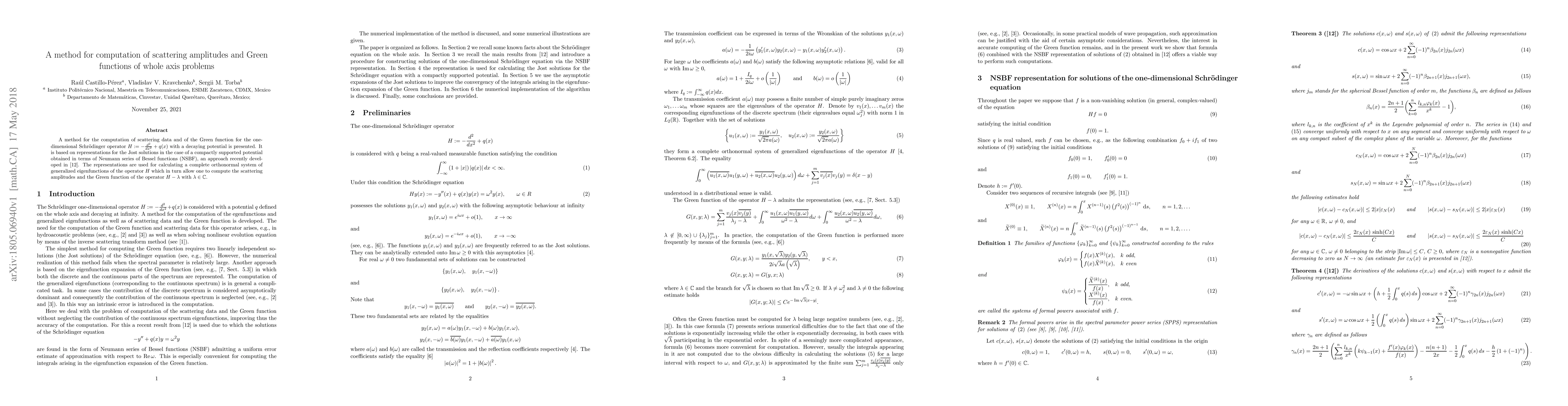 A method for the computation of scattering data and of the Green function for the one-dimensional Schr\"{o}dinger operator $H:=-\frac{d^2}{dx^2}+q(x)$ with a decaying potential is presented. It is based on representations for the Jost solutions in the case of a compactly supported potential obtained in terms of Neumann series of Bessel functions (NSBF), an approach recently developed in arXiv:1508.02738. The representations are used for calculating a complete orthonormal system of generalized eigenfunctions of the operator $H$ which in turn allow one to compute the scattering amplitudes and the Green function of the operator $H-\lambda$ with $\lambda\in\mathbb{C}$.