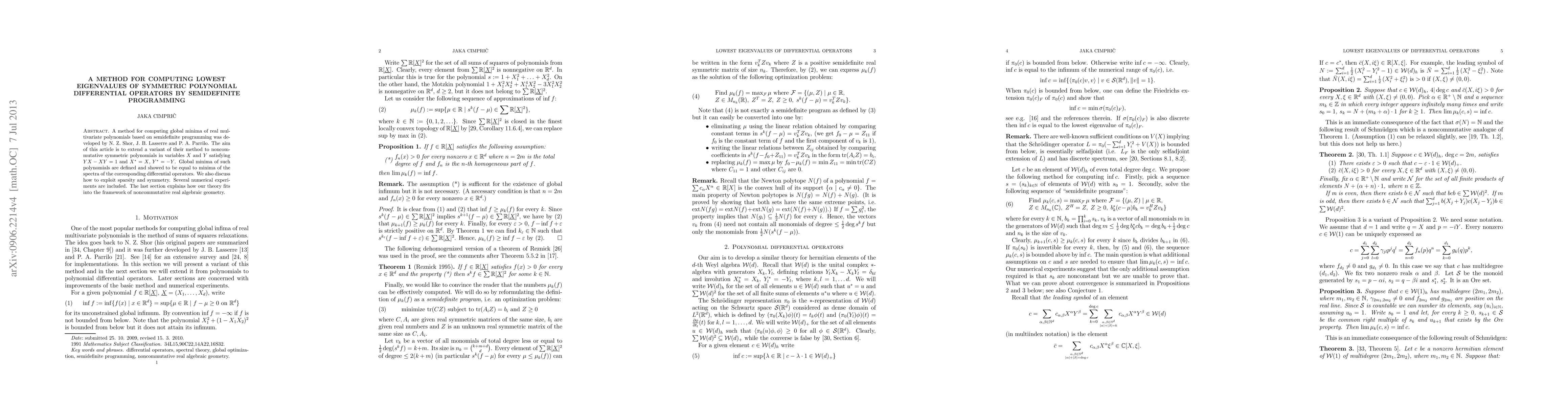 A method for computing global minima of real multivariate polynomials based on semidefinite programming was developed by N. Z. Shor, J. B. Lasserre and P. A. Parrilo. The aim of this article is to extend a variant of their method to noncommutative symmetric polynomials in variables $X$ and $Y$ satisfying $YX-XY=1$ and $X^\ast=X$, $Y^\ast=-Y$. Global minima of such polynomials are defined and showed to be equal to minima of the spectra of the corresponding differential operators. We also discuss how to exploit sparsity and symmetry. Several numerical experiments are included. The last section explains how our theory fits into the framework of noncommutative real algebraic geometry.