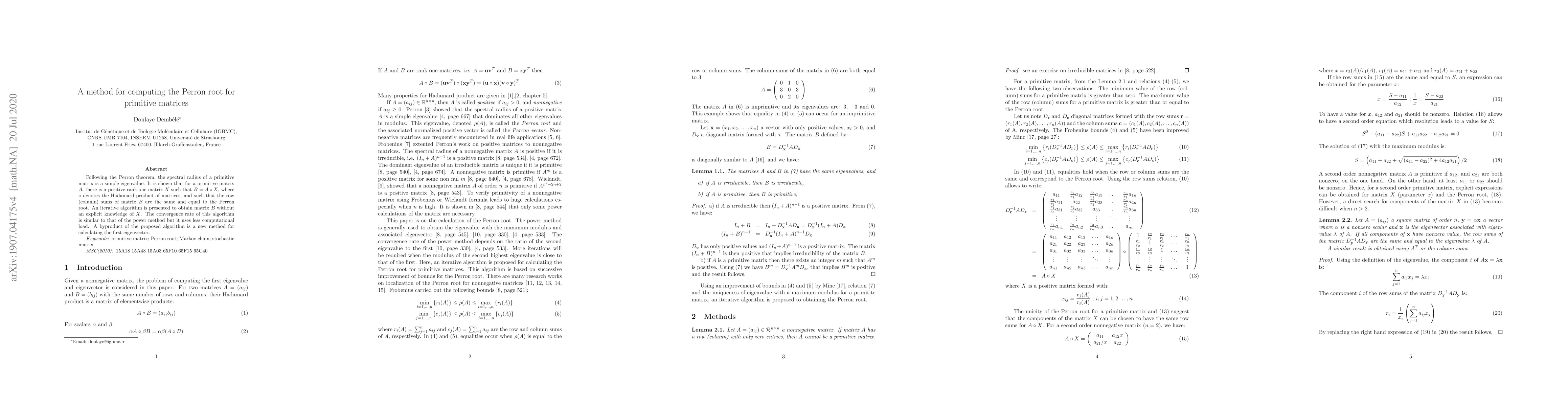 Following the Perron-Frobenius theorem, the spectral radius of a primitive matrix is a simple eigenvalue. It is shown that for a primitive matrix $A$, there is a positive rank one matrix $X$ such that $B = A \circ X$, where $\circ$ denotes the Hadamard product of matrices, and such that the row (column) sums of matrix $B$ are the same and equal to the Perron root. An iterative algorithm is presented to obtain matrix $B$ without an explicit knowledge of $X$. The convergence rate of this algorithm is similar to that of the power method but it uses less computational load. A byproduct of the proposed algorithm is a new method for calculating the first eigenvector.