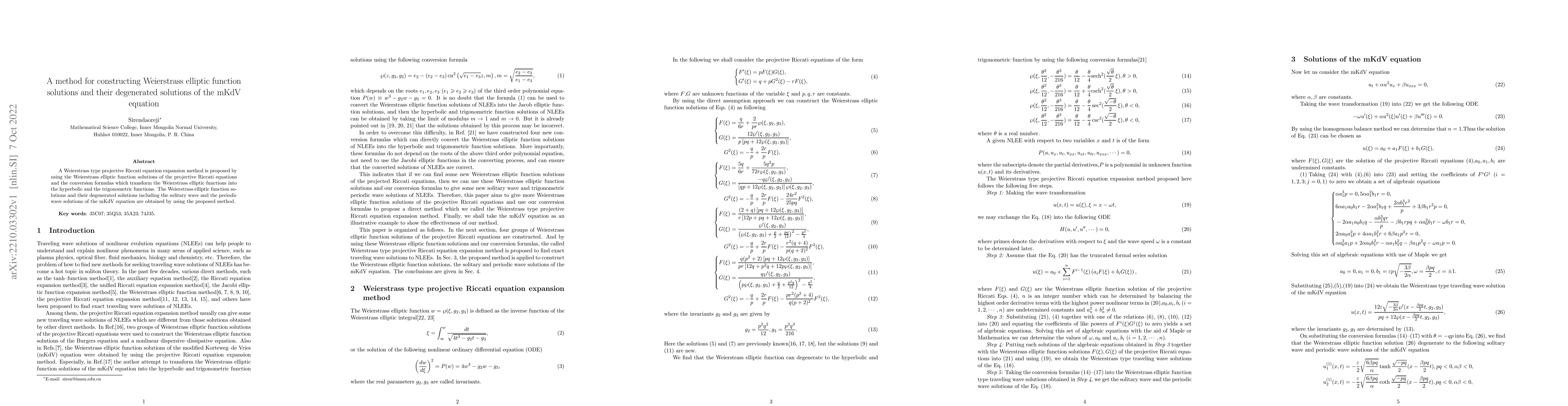 This paper proposes a method to construct Weierstrass elliptic function solutions and their degenerated forms for the mKdV equation using a Weierstrass type projective Riccati equation expansion, transforming these functions into hyperbolic and trigonometric forms. The method yields solitary and periodic wave solutions for the mKdV equation.