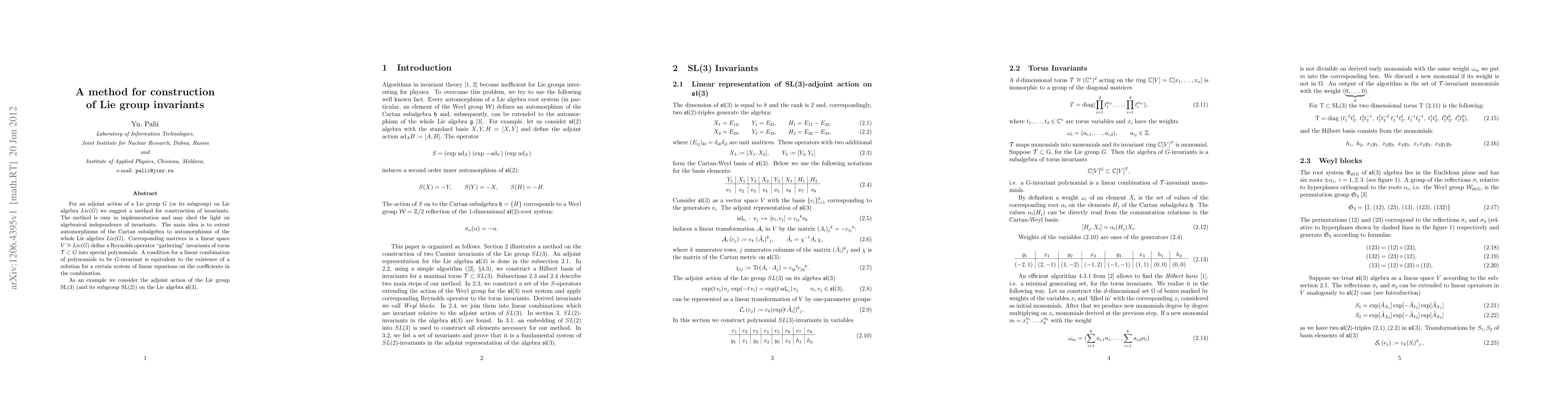 For an adjoint action of a Lie group G (or its subgroup) on Lie algebra Lie(G) we suggest a method for construction of invariants. The method is easy in implementation and may shed the light on algebraical independence of invariants. The main idea is to extent automorphisms of the Cartan subalgebra to automorphisms of the whole Lie algebra Lie(G). Corresponding matrices in a linear space V=Lie(G) define a Reynolds operator "gathering" invariants of torus T in G into special polynomials. A condition for a linear combination of polynomials to be G-invariant is equivalent to the existence of a solution for a certain system of linear equations on the coefficients in the combination. As an example we consider the adjoint action of the Lie group SL(3) (and its subgroup SL(2)) on the Lie algebra sl(3).