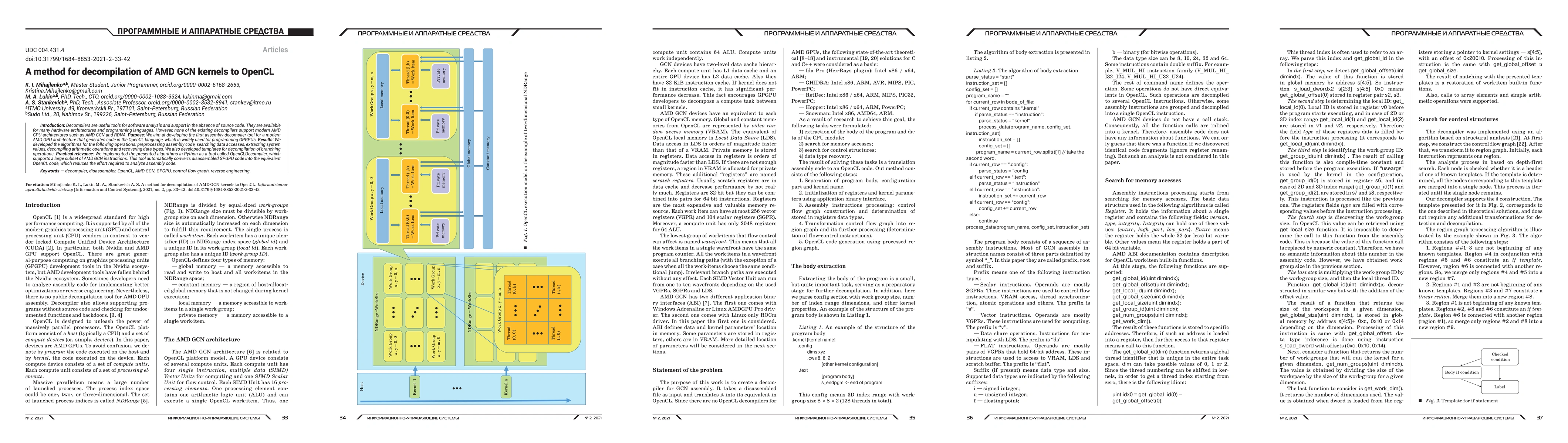 Introduction: Decompilers are useful tools for software analysis and support in the absence of source code. They are available for many hardware architectures and programming languages. However, none of the existing decompilers support modern AMD GPU architectures such as AMD GCN and RDNA. Purpose: We aim at developing the first assembly decompiler tool for a modern AMD GPU architecture that generates code in the OpenCL language, which is widely used for programming GPGPUs. Results: We developed the algorithms for the following operations: preprocessing assembly code, searching data accesses, extracting system values, decompiling arithmetic operations and recovering data types. We also developed templates for decompilation of branching operations. Practical relevance: We implemented the presented algorithms in Python as a tool called OpenCLDecompiler, which supports a large subset of AMD GCN instructions. This tool automatically converts disassembled GPGPU code into the equivalent OpenCL code, which reduces the effort required to analyze assembly code.