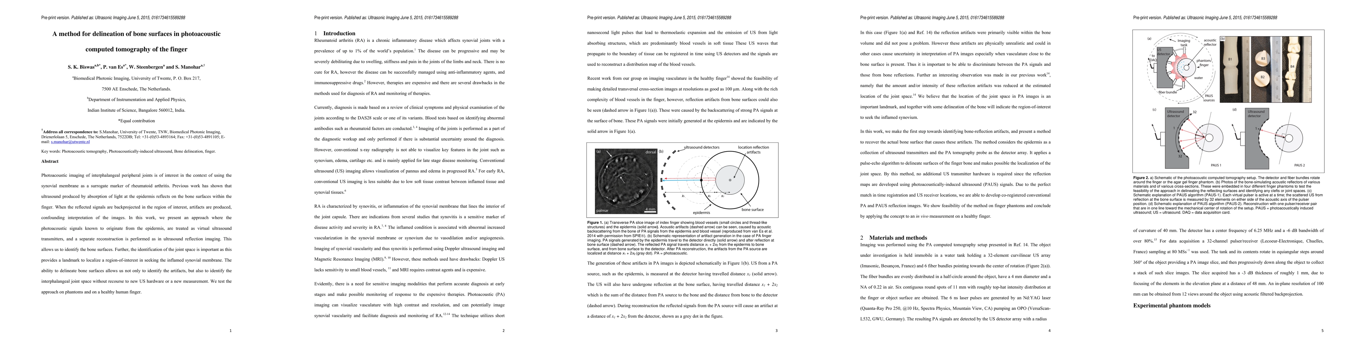 Photoacoustic imaging of interphalangeal peripheral joints is of interest in the context of using the synovial membrane as a surrogate marker of rheumatoid arthritis. Previous work has shown that ultrasound produced by absorption of light at the epidermis reflects on the bone surfaces within the finger. When the reflected signals are backprojected in the region of interest, artifacts are produced, confounding interpretation of the images. In this work, we present an approach where the photoacoustic signals known to originate from the epidermis, are treated as virtual ultrasound transmitters, and a separate reconstruction is performed as in ultrasound reflection imaging. This allows us to identify the bone surfaces. Further, the identification of the joint space is important as this provides a landmark to localize a region-of-interest in seeking the inflamed synovial membrane. The ability to delineate bone surfaces allows us not only to identify the artifacts, but also to identify the interphalangeal joint space without recourse to new US hardware or a new measurement. We test the approach on phantoms and on a healthy human finger.