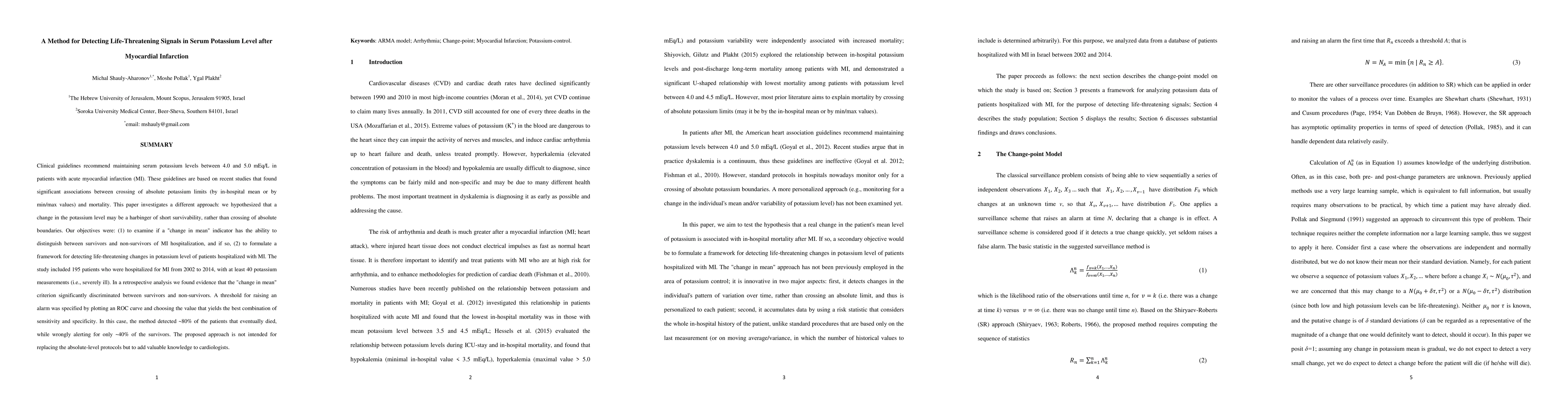 Clinical guidelines recommend maintaining serum potassium levels between 4.0 and 5.0 mEq/L in patients with acute myocardial infarction (MI). These guidelines are based on recent studies that found significant associations between crossing of absolute potassium limits (by in-hospital mean or by min/max values) and mortality. This paper investigates a different approach: we hypothesized that a change in the potassium level may be a harbinger of short survivability, rather than crossing of absolute boundaries. Our objectives were: (1) to examine if a "change in mean" indicator has the ability to distinguish between survivors and non-survivors of MI hospitalization, and if so, (2) to formulate a framework for detecting life-threatening changes in potassium level of patients hospitalized with MI. The study included 195 patients who were hospitalized for MI from 2002 to 2014, with at least 40 potassium measurements (i.e., severely ill). In a retrospective analysis we found evidence that the "change in mean" criterion significantly discriminated between survivors and non-survivors. A threshold for raising an alarm was specified by plotting an ROC curve and choosing the value that yields the best combination of sensitivity and specificity. In this case, the method detected ~80% of the patients that eventually died, while wrongly alerting for only ~40% of the survivors. The proposed approach is not intended for replacing the absolute-level protocols but to add valuable knowledge to cardiologists.