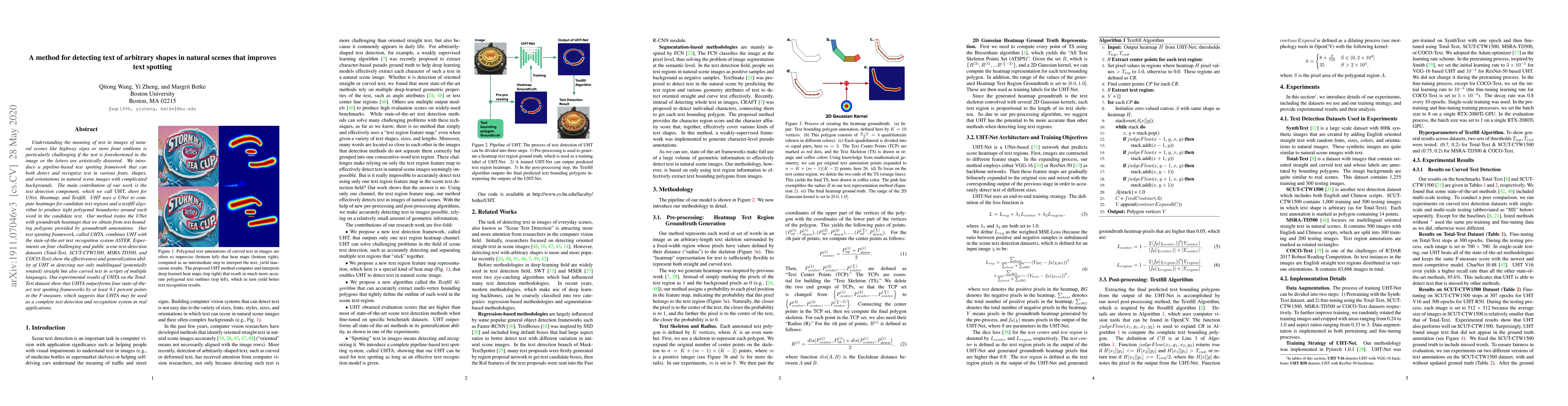 This paper introduces a pipeline-based text spotting framework, UHTA, which combines UHT (UNet, Heatmap, and Textfill) for text detection and ASTER for text recognition. UHT effectively detects and recognizes text in various shapes, fonts, and orientations in complex natural scene backgrounds, outperforming existing methods by at least 9.1 percent points in F-measure on multiple datasets.
