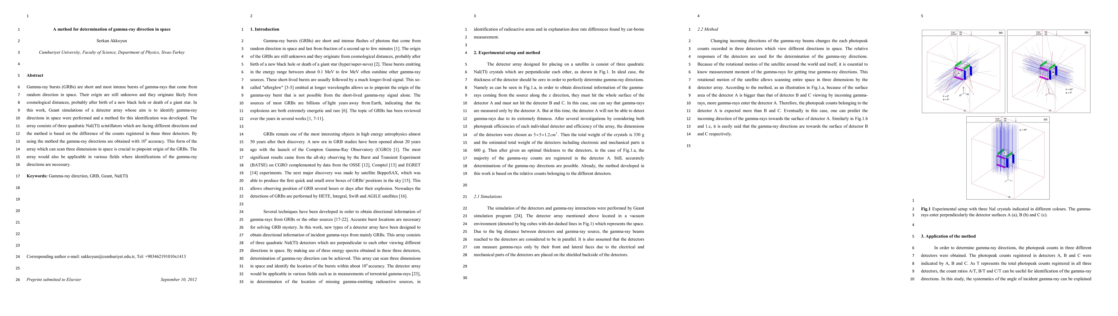 Gamma-ray bursts (GRBs) are short and most intense bursts of gamma-rays that come from random direction in space. Their origin are still unknown and they originate likely from cosmological distances, probably after birth of a new black hole or death of a giant star. In this work, Geant simulations of a detector array whose aim is to identify gamma-ray directions in space were performed and a method for this identification was developed. The array consists of three quadratic NaI(Tl) scintillators which are facing different directions and the method is based on the difference of the counts registered in these three detectors. By using the method the gamma-ray directions are obtained with 10o accuracy. This form of the array which can scan three dimensions in space is crucial to pinpoint origin of the GRBs. The array would also be applicable in various fields where identifications of the gamma-ray directions are necessary.