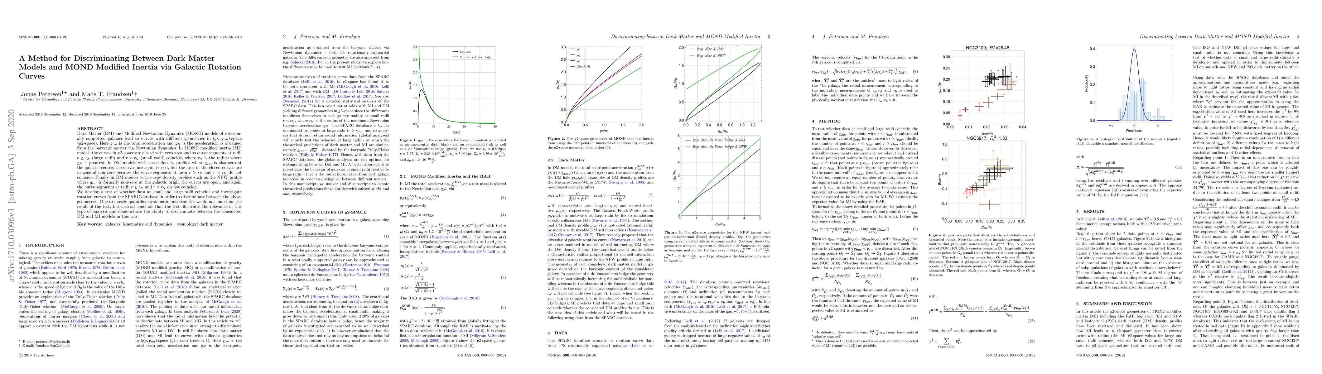 This paper proposes a method to distinguish between Dark Matter and Modified Newtonian Dynamics models by analyzing galactic rotation curves in $g2$-space. It finds that while MOND models yield closed curves with coinciding segments at different radii, Dark Matter models, especially those with cored or cuspy density profiles, produce different geometries, allowing for discrimination based on the rotation curve data.