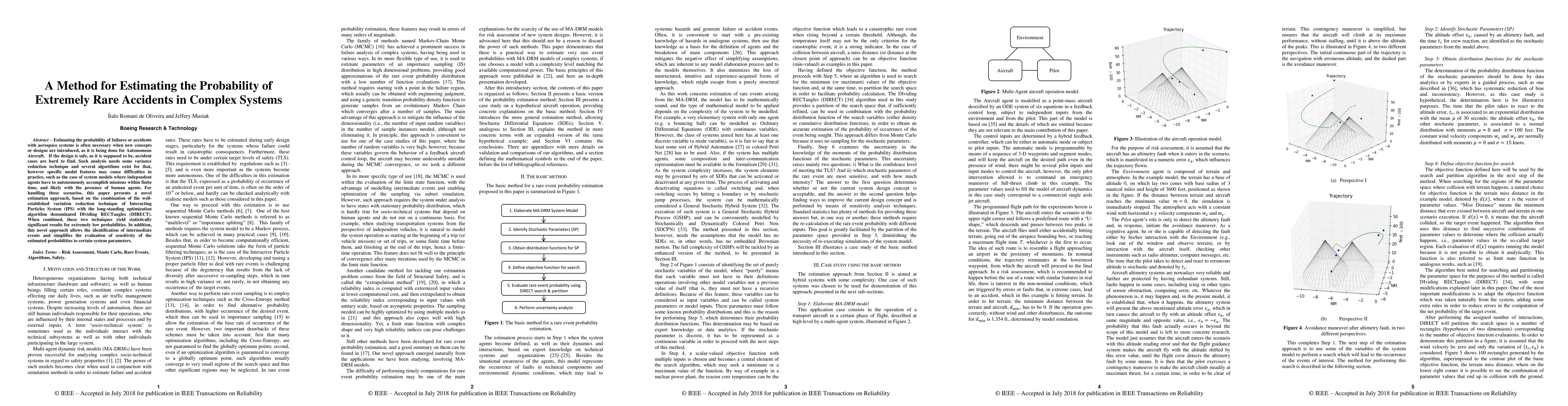 Estimating the probability of failures or accidents with aerospace systems is often necessary when new concepts or designs are introduced, as it is being done for Autonomous Aircraft. If the design is safe, as it is supposed to be, accident cases are hard to find. Such analysis needs some variance reduction technique and several algorithms exist for that, however specific model features may cause difficulties in practice, such as the case of system models where independent agents have to autonomously accomplish missions within finite time, and likely with the presence of human agents. For handling these scenarios, this paper presents a novel estimation approach, based on the combination of the well-established variation reduction technique of Interacting Particles System (IPS) with the long-standing optimization algorithm denominated DIviding RECTangles (DIRECT). When combined, these two techniques yield statistically significant results for extremely low probabilities. In addition, this novel approach allows the identification of intermediate events and simplifies the evaluation of sensitivity of the estimated probabilities to certain system parameters.