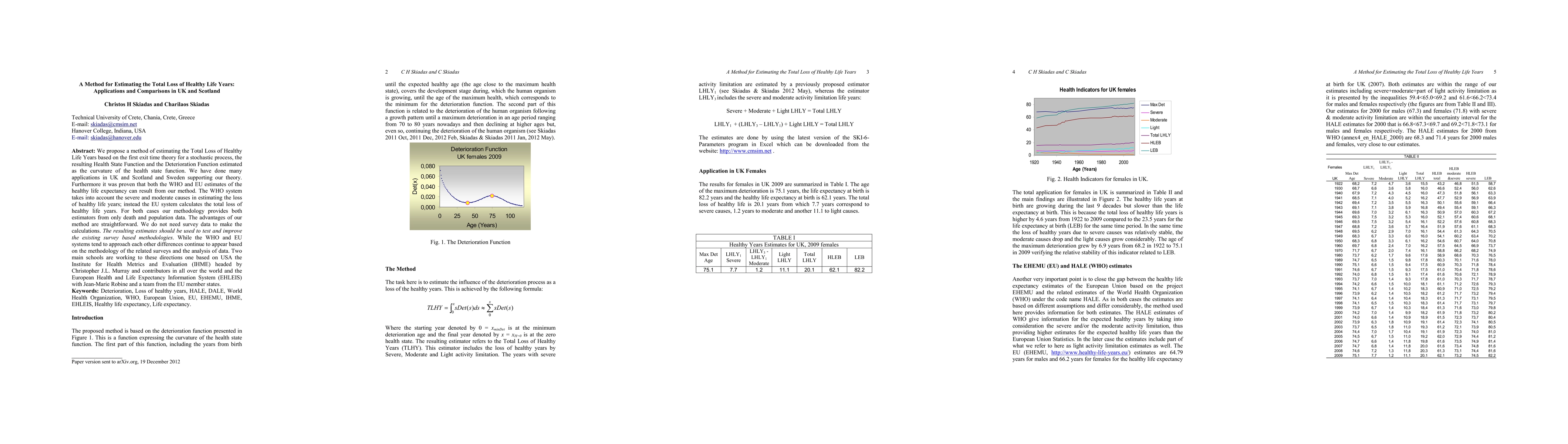 We propose a method of estimating the Total Loss of Healthy Life Years based on the first exit time theory for a stochastic process, the resulting Health State Function and the Deterioration Function estimated as the curvature of the health state function. We have done many applications in UK and Scotland and Sweden supporting our theory. Furthermore it was proven that both the WHO and EU estimates of the healthy life expectancy can result from our method. The WHO system takes into account the severe and moderate causes in estimating the loss of healthy life years; instead the EU system calculates the total loss of healthy life years. For both cases our methodology provides both estimators from only death and population data. The advantages of our method are straightforward. We do not need survey data to make the calculations. The resulting estimates should be used to test and improve the existing survey based methodologies. While the WHO and EU systems tend to approach each other differences continue to appear based on the methodology of the related surveys and the analysis of data. Two main schools are working to these directions one based on USA the Institute for Health Metrics and Evaluation (IHME) headed by Christopher J.L. Murray and contributors in all over the world and the European Health and Life Expectancy Information System (EHLEIS) with Jean-Marie Robine and a team from the EU member states. Keywords: Deterioration, Loss of healthy years, HALE, DALE, World Health Organization, WHO, European Union, EU, EHEMU, IHME, EHLEIS, Healthy life expectancy, Life expectancy.