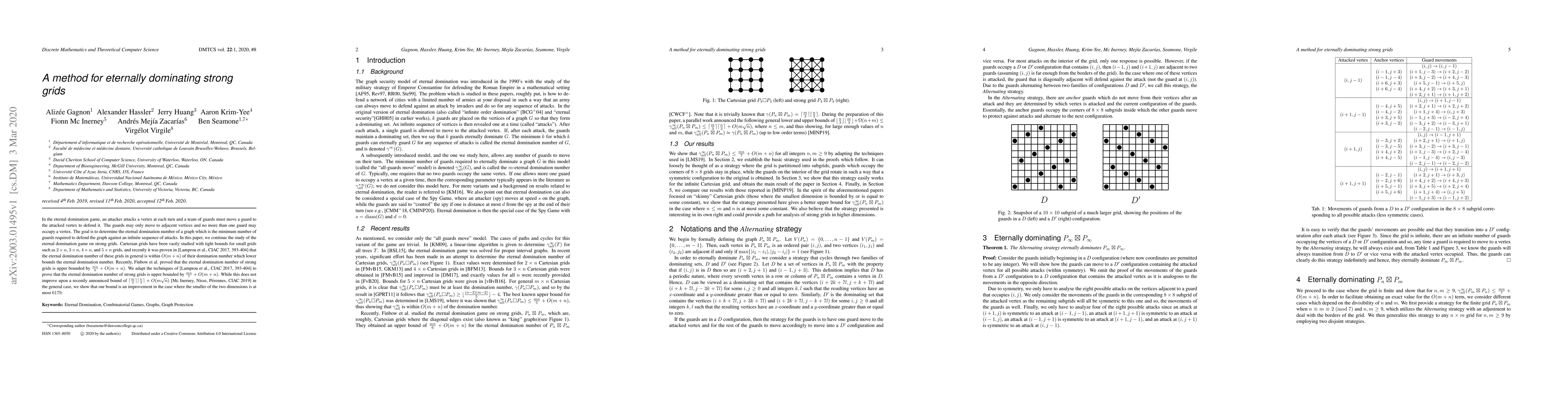 This paper studies the eternal domination game on strong grids, refining existing bounds on the eternal domination number—the minimum guards needed to defend against infinite attacks. The authors improve the upper bound to $\frac{mn}{7}+O(m+n)$ for strong grids, showing it is better when the smaller dimension is at most 6179.