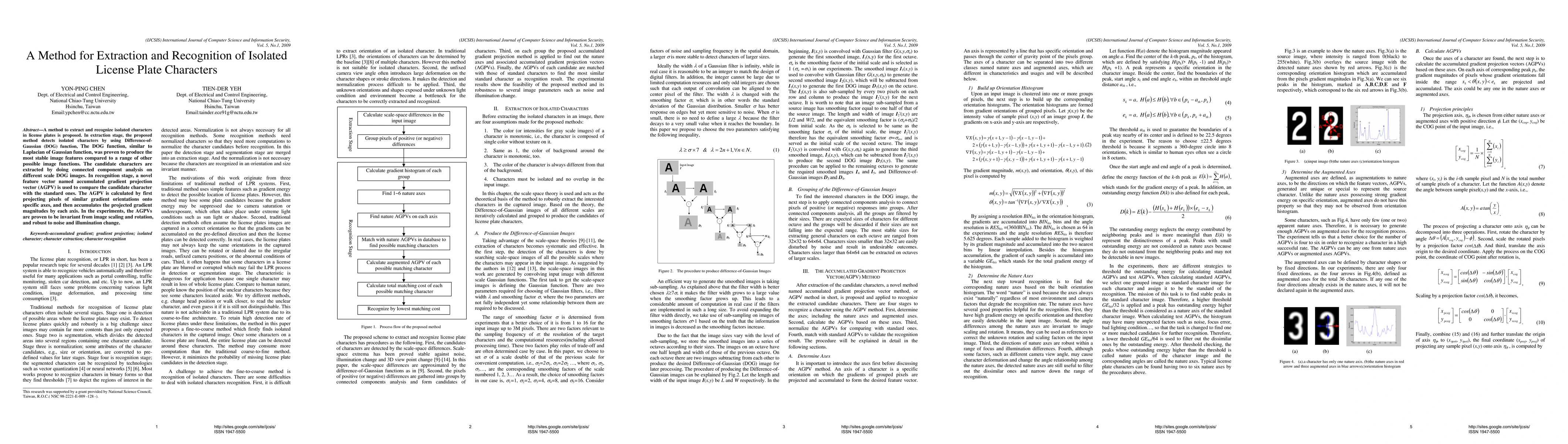 A method for extracting and recognizing isolated characters in license plates uses a Difference-of-Gaussian function to detect characters and an accumulated gradient projection vector to compare them with standard ones.