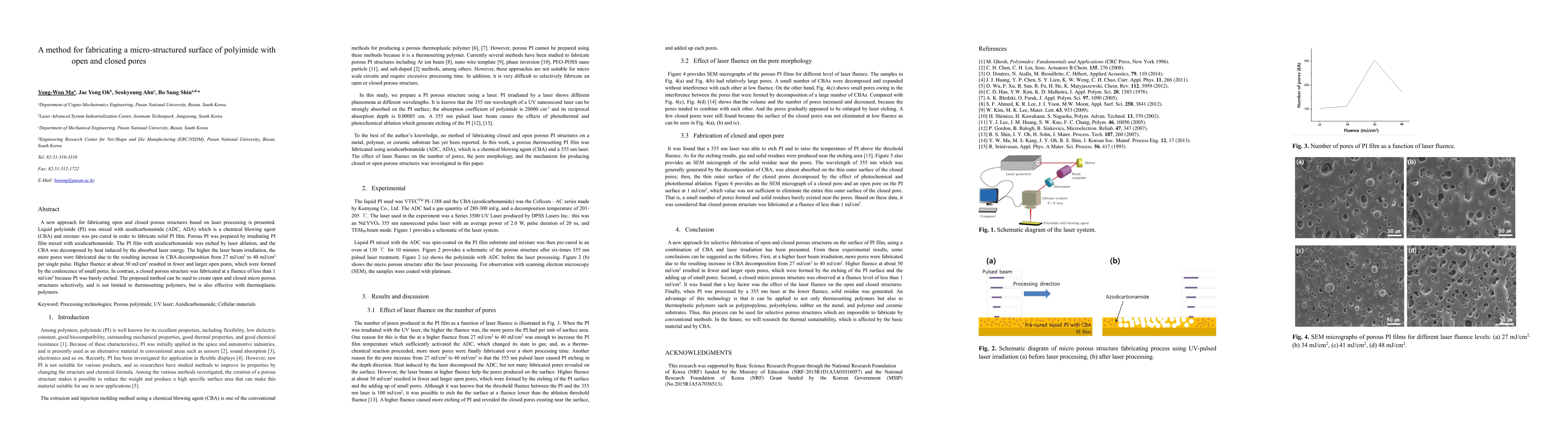 A new approach for fabricating open and closed porous structures based on laser processing is presented. Liquid polyimide (PI) was mixed with azodicarbonamide (ADC, ADA) which is a chemical blowing agent (CBA) and mixture was pre-cured in order to fabricate solid PI film. Porous PI was prepared by irradiating PI film mixed with azodicarbonamide. The PI film with azodicarbonamide was etched by laser ablation, and the CBA was decomposed by heat induced by the absorbed laser energy. The higher the laser beam irradiation, the more pores were fabricated due to the resulting increase in CBA decomposition from 27 mJ/cm2 to 40 mJ/cm2 per single pulse. Higher fluence at about 50 mJ/cm2 resulted in fewer and larger open pores, which were formed by the coalescence of small pores. In contrast, a closed porous structure was fabricated at a fluence of less than 1 mJ/cm2 because PI was barely etched. The proposed method can be sued to create open and closed micro porous structures selectively, and is not limited to thermosetting polymers, but is also effective with thermoplastic polymers.