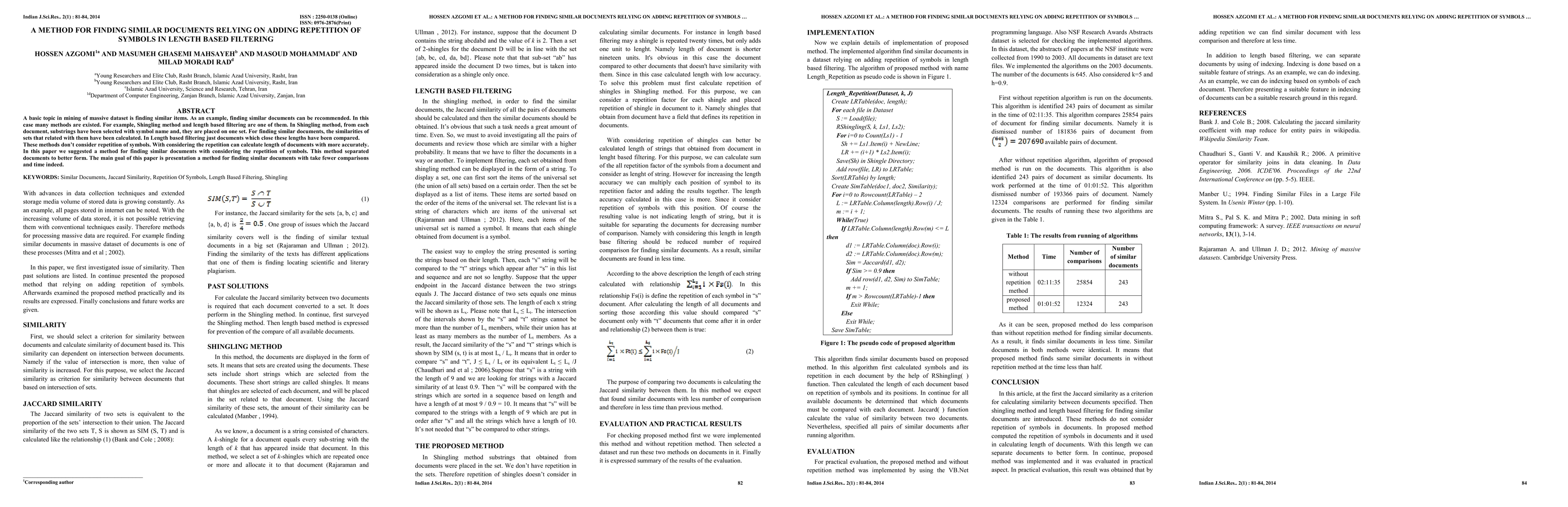 A basic topic in mining of massive dataset is finding similar items. As an example, finding similar documents can be recommended. In this case many methods are existed. For example, Shingling method and length based filtering are one of them. In Shingling method, from each document, substrings have been selected with symbol name and, they are placed on one set. For finding similar documents, the similarities of sets that related with them have been calculated. In Length based filtering just documents which close these lengths have been compared. These methods don't consider repetition of symbols. With considering the repetition can calculate length of documents with more accurately. In this paper we suggested a method for finding similar documents with considering the repetition of symbols. This method separated documents to better form. The main goal of this paper is presentation a method for finding similar documents with take fewer comparisons and time indeed.