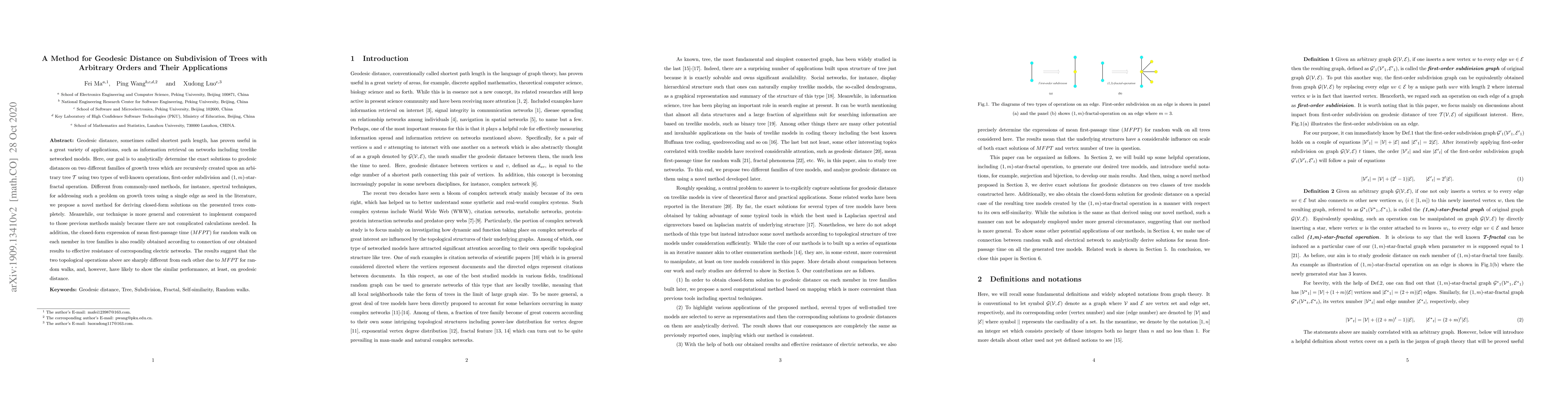 This research presents a novel method for calculating exact geodesic distances on two tree families created from an arbitrary tree using first-order subdivision and ($1,m$)-star-fractal operations. The approach offers closed-form solutions, is more general and easier to implement than previous methods. It also provides mean first-passage time expressions for random walks on these trees, revealing distinct behaviors of the two topological operations while showing similar performance in geodesic distance measurements.