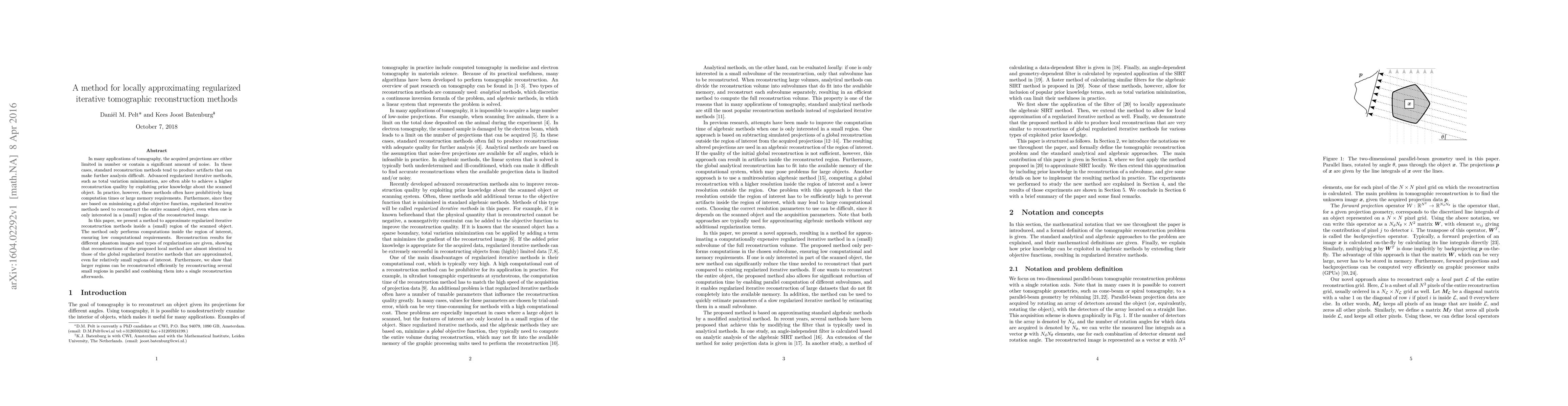In many applications of tomography, the acquired projections are either limited in number or contain a significant amount of noise. In these cases, standard reconstruction methods tend to produce artifacts that can make further analysis difficult. Advanced regularized iterative methods, such as total variation minimization, are often able to achieve a higher reconstruction quality by exploiting prior knowledge about the scanned object. In practice, however, these methods often have prohibitively long computation times or large memory requirements. Furthermore, since they are based on minimizing a global objective function, regularized iterative methods need to reconstruct the entire scanned object, even when one is only interested in a (small) region of the reconstructed image. In this paper, we present a method to approximate regularized iterative reconstruction methods inside a (small) region of the scanned object. The method only performs computations inside the region of interest, ensuring low computational requirements. Reconstruction results for different phantom images and types of regularization are given, showing that reconstructions of the proposed local method are almost identical to those of the global regularized iterative methods that are approximated, even for relatively small regions of interest. Furthermore, we show that larger regions can be reconstructed efficiently by reconstructing several small regions in parallel and combining them into a single reconstruction afterwards.