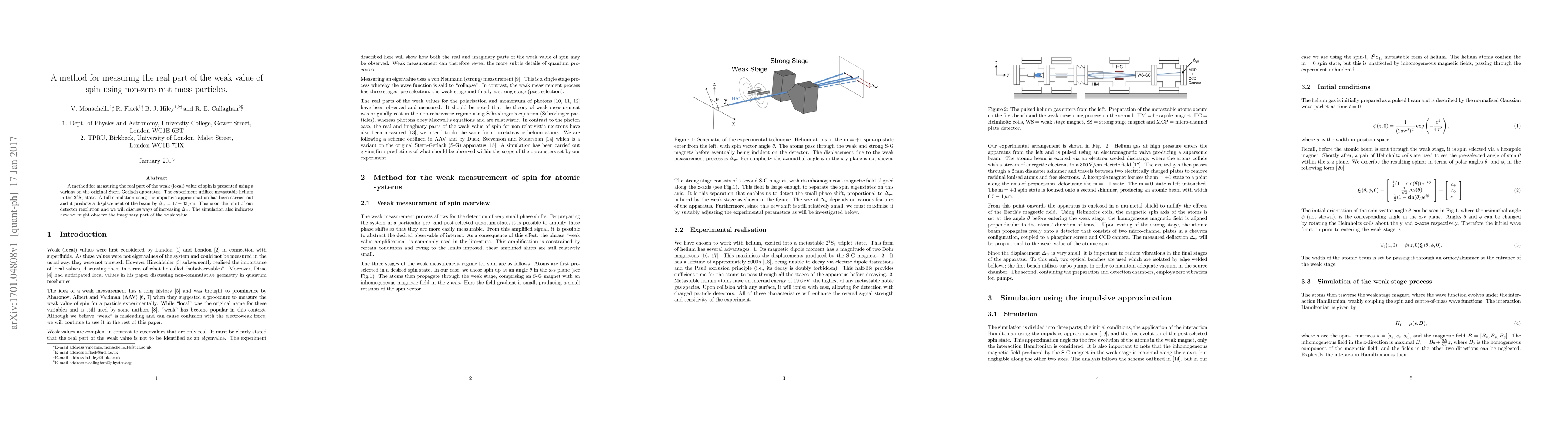 A method for measuring the real part of the weak (local) value of spin is presented using a variant on the original Stern-Gerlach apparatus. The experiment utilises metastable helium in the $\rm 2^{3}S_{1}$ state. A full simulation using the impulsive approximation has been carried out and it predicts a displacement of the beam by $\rm \Delta_{w} = 17 - 33\,\mu m$. This is on the limit of our detector resolution and we will discuss ways of increasing $\rm \Delta_{w}$. The simulation also indicates how we might observe the imaginary part of the weak value.
