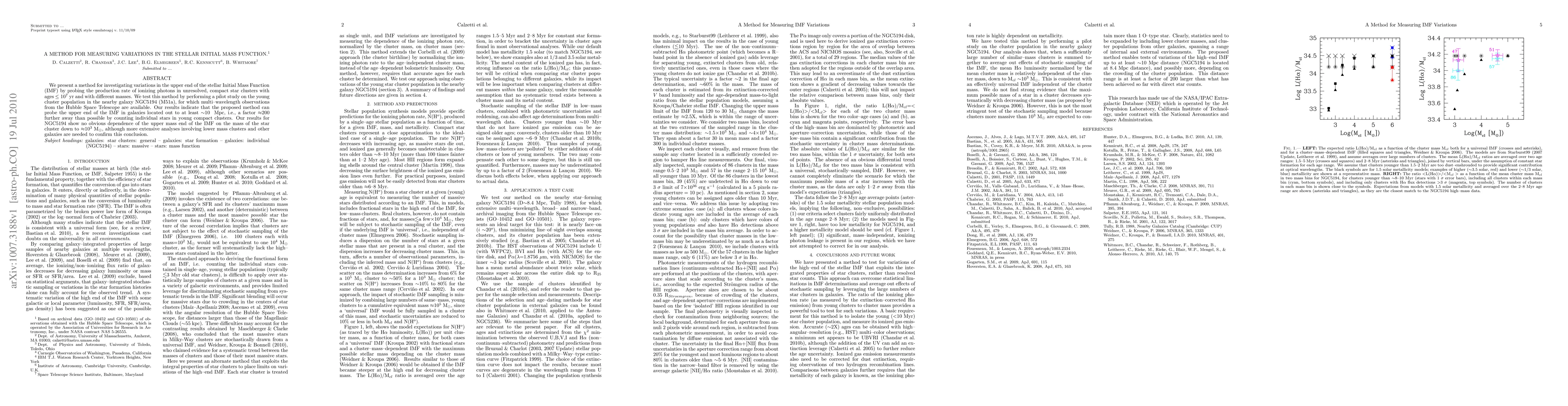 This paper introduces a novel method for measuring variations in the stellar Initial Mass Function (IMF) by examining ionizing photon production in young, compact star clusters, and tests it on NGC5194. The method extends the reach for probing the IMF to galaxies up to ~10 Mpc away, revealing no clear dependence of the upper IMF on cluster mass down to ~1000 M_sun.