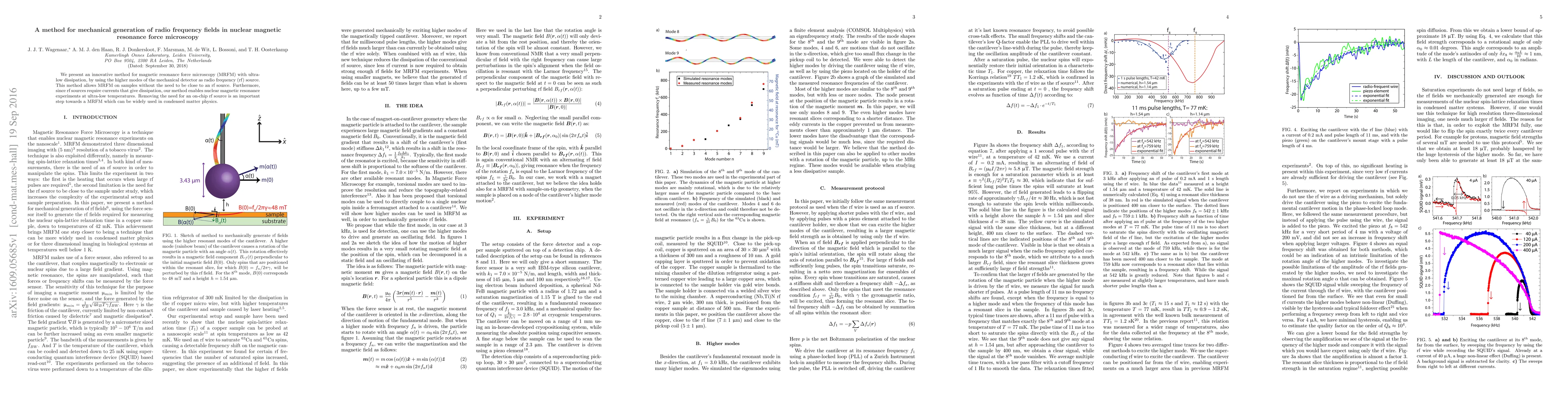This paper introduces an innovative method for magnetic resonance force microscopy (MRFM) that utilizes the higher modes of the mechanical detector as a radio frequency source, eliminating the need for an on-chip rf source and enabling experiments at ultra-low temperatures without dissipation. This advancement facilitates MRFM applications in condensed matter physics.
