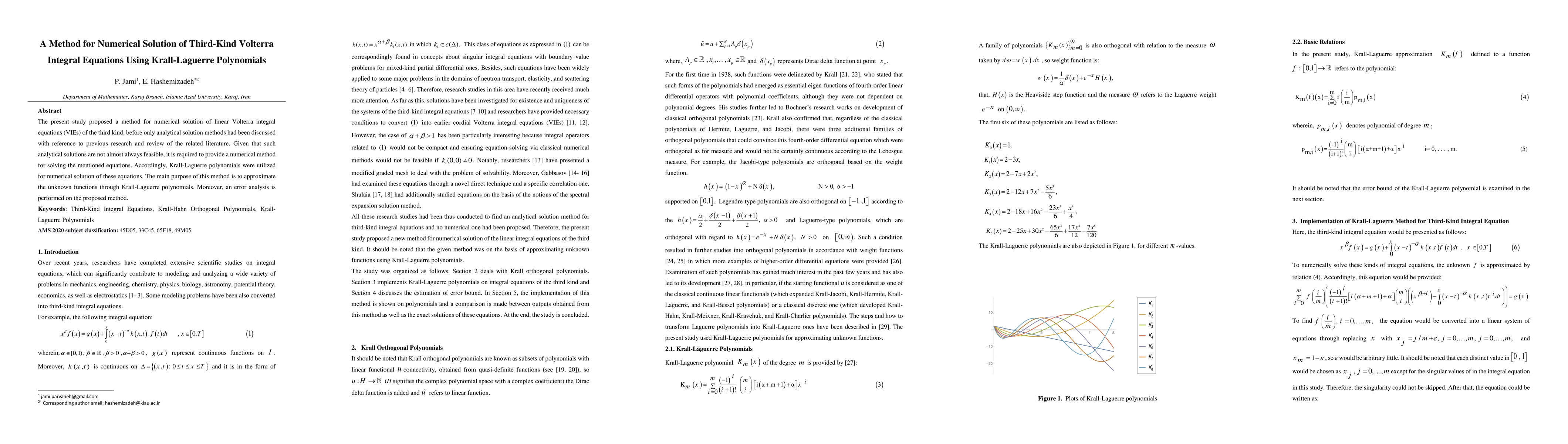 This paper introduces a numerical method using Krall-Laguerre polynomials to solve linear Volterra integral equations of the third kind, where analytical solutions are often impractical. The method approximates unknown functions and includes an error analysis to evaluate its accuracy.