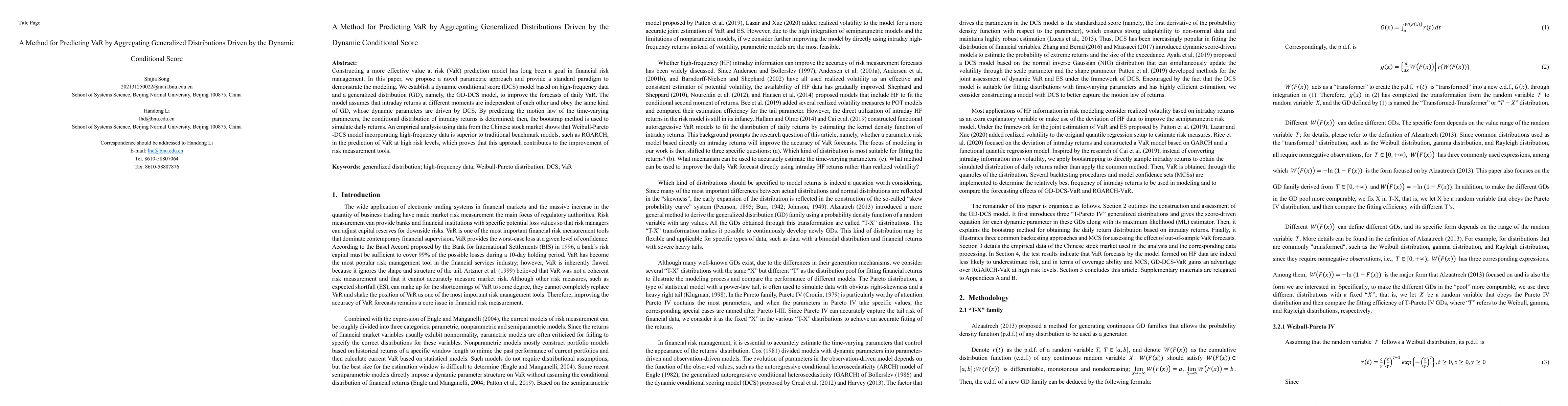 Constructing a more effective value at risk (VaR) prediction model has long been a goal in financial risk management. In this paper, we propose a novel parametric approach and provide a standard paradigm to demonstrate the modeling. We establish a dynamic conditional score (DCS) model based on high-frequency data and a generalized distribution (GD), namely, the GD-DCS model, to improve the forecasts of daily VaR. The model assumes that intraday returns at different moments are independent of each other and obey the same kind of GD, whose dynamic parameters are driven by DCS. By predicting the motion law of the time-varying parameters, the conditional distribution of intraday returns is determined; then, the bootstrap method is used to simulate daily returns. An empirical analysis using data from the Chinese stock market shows that Weibull-Pareto -DCS model incorporating high-frequency data is superior to traditional benchmark models, such as RGARCH, in the prediction of VaR at high risk levels, which proves that this approach contributes to the improvement of risk measurement tools.