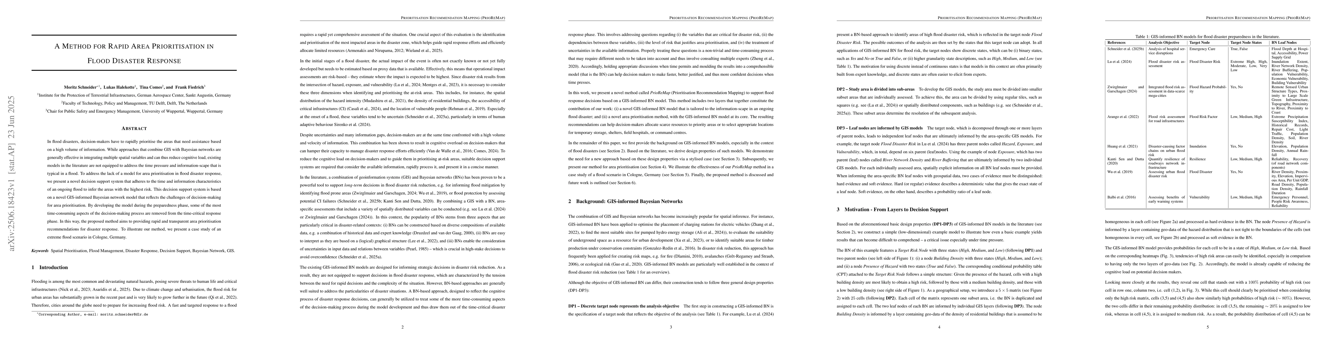 In flood disasters, decision-makers have to rapidly prioritise the areas that need assistance based on a high volume of information. While approaches that combine GIS with Bayesian networks are generally effective in integrating multiple spatial variables and can thus reduce cognitive load, existing models in the literature are not equipped to address the time pressure and information-scape that is typical in a flood. To address the lack of a model for area prioritisation in flood disaster response, we present a novel decision support system that adheres to the time and information characteristics of an ongoing flood to infer the areas with the highest risk. This decision support system is based on a novel GIS-informed Bayesian network model that reflects the challenges of decision-making for area prioritisation. By developing the model during the preparedness phase, some of the most time-consuming aspects of the decision-making process are removed from the time-critical response phase. In this way, the proposed method aims to providing rapid and transparent area prioritisation recommendations for disaster response. To illustrate our method, we present a case study of an extreme flood scenario in Cologne, Germany.
