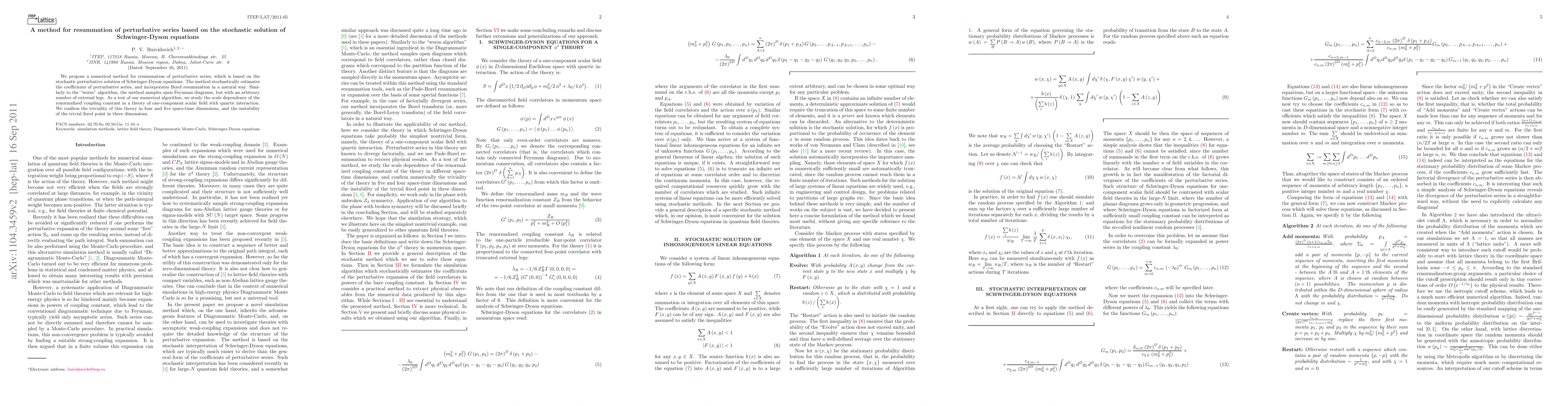 This paper proposes a novel numerical method for resummation of perturbative series using stochastic solutions of Schwinger-Dyson equations, incorporating Borel resummation naturally. The method tests its efficacy by confirming the triviality of a scalar field theory in higher dimensions and instability in three dimensions.
