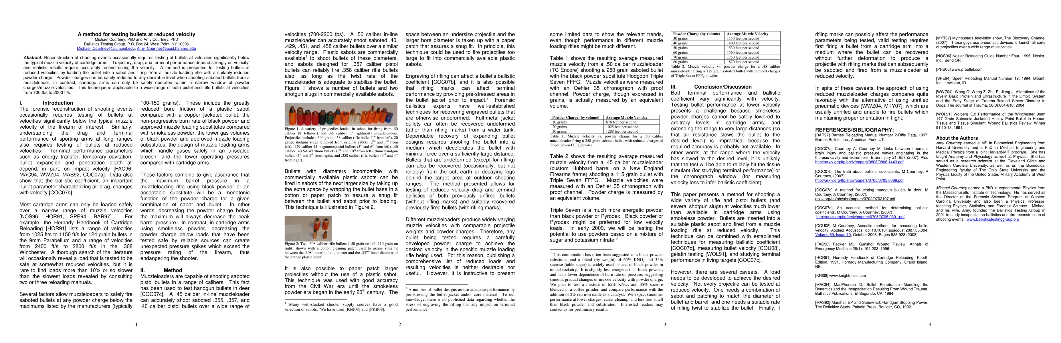 Researchers developed a method to test bullets at reduced velocities by firing them from a muzzle loader with a reduced powder charge, allowing for realistic trajectory and terminal performance testing without risking cartridge damage.