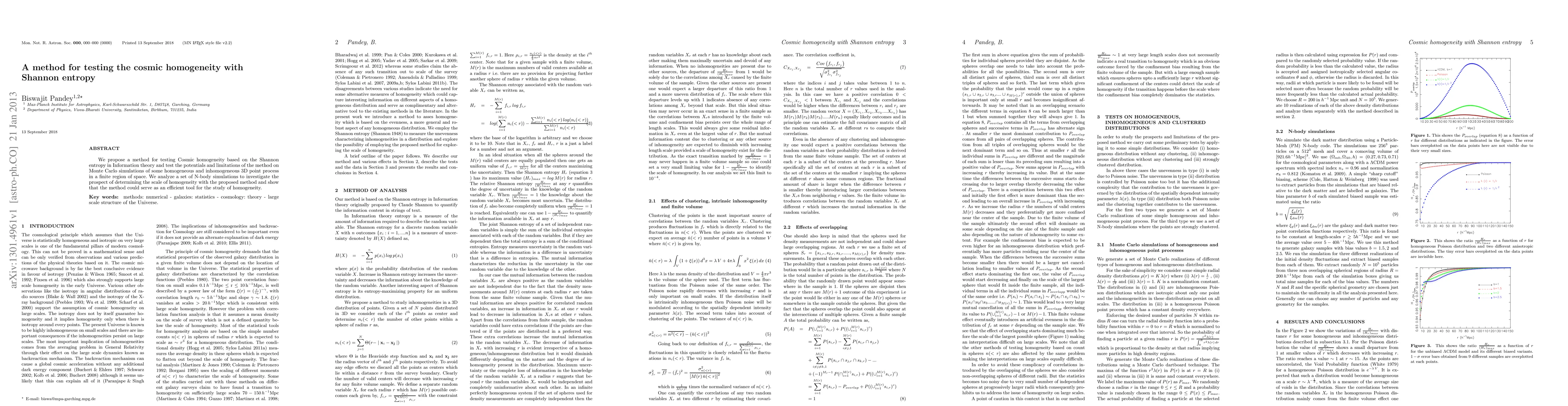 This paper introduces a novel method for testing cosmic homogeneity using Shannon entropy from Information theory, demonstrating its effectiveness and limitations through Monte Carlo simulations and N-body simulations. The proposed method shows promise as an efficient tool for determining the scale of homogeneity in the universe.