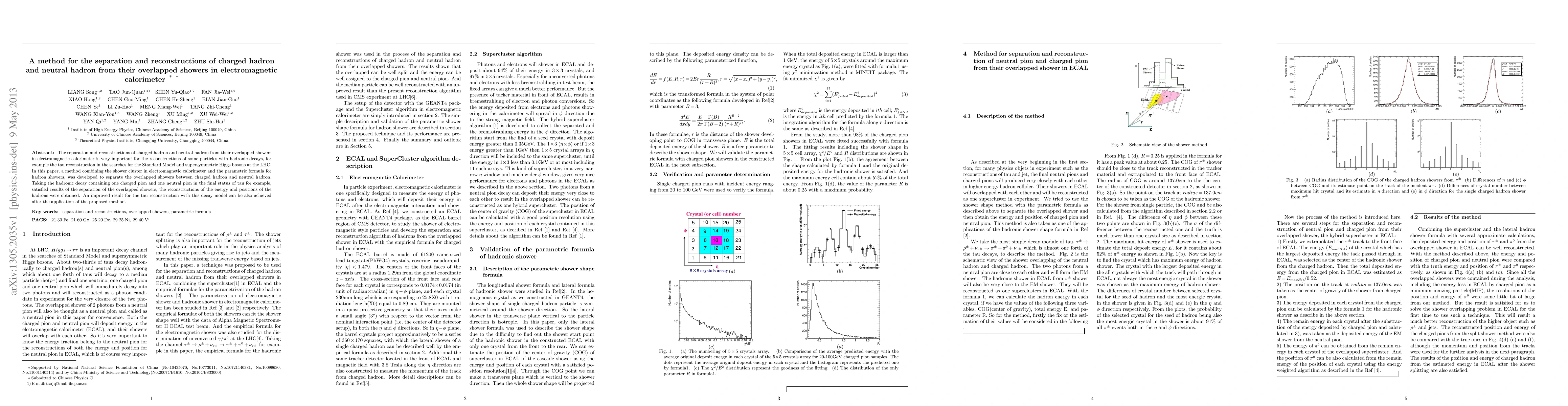 The separation and reconstructions of charged hadron and neutral hadron from their overlapped showers in electromagnetic calorimeter is very important for the reconstructions of some particles with hadronic decays, for example the tau reconstruction in the searches for the Standard Model and supersymmetric Higgs bosons at the LHC. In this paper, a method combining the shower cluster in electromagnetic calorimeter and the parametric formula for hadron showers, was developed to separate the overlapped showers between charged hadron and neutral hadron. Taking the hadronic decay containing one charged pion and one neutral pion in the final status of tau for example, satisfied results of the separation of the overlapped showers, the reconstructions of the energy and positions of the hadrons were obtained. An improved result for the tau reconstruction with this decay model can be also achieved after the application of the proposed method.
